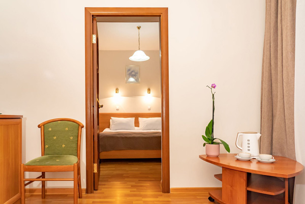 В номере: зеркало, кровать двуспальная, прикроватные тумбочки, стол, столик кофейный, стулья, шкаф, кондиционер, мини-холодильник, сейф, телевизор, телефон, чайная станция, чайный набор посуды, электрочайник