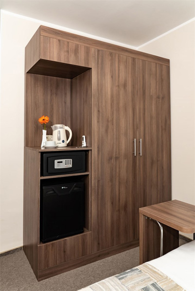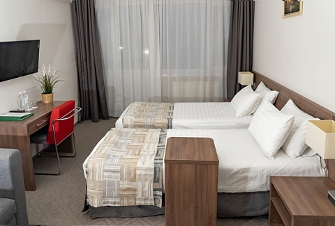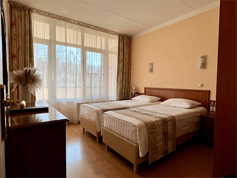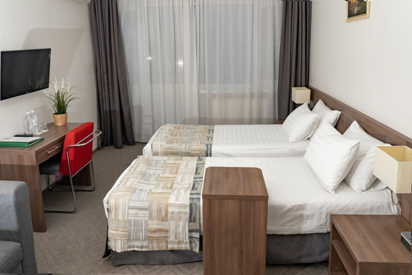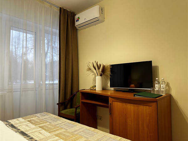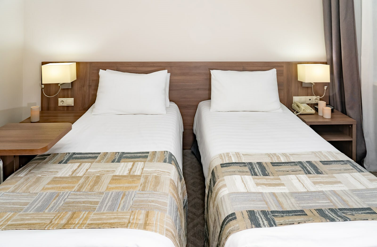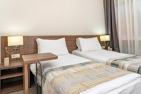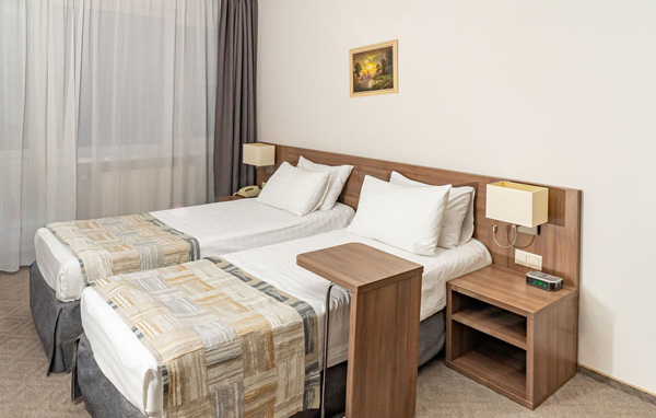 В номере: зеркало, кровати односпальные, прикроватные тумбочки, стол, стулья, шкаф, мини-холодильник, телевизор, телефон