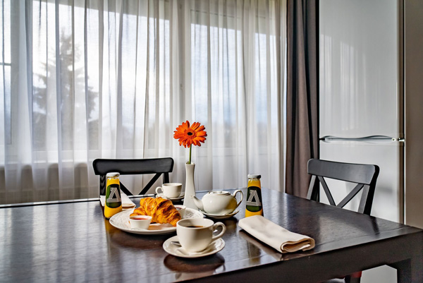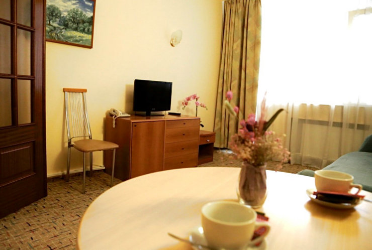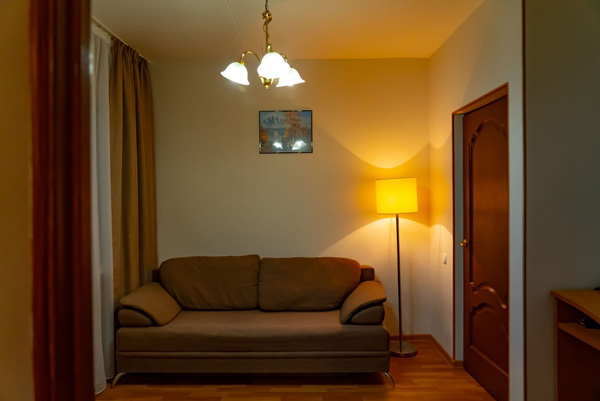 В номере: вешалка, диван, зеркало, кровати односпальные /одна двуспальная кровать, прикроватные тумбочки, стол, стулья, тумба, шкаф, кондиционер, мини-холодильник, набор посуды, плита электрическая, телевизор ЖК, телефон, чайный набор посуды, электрочайник