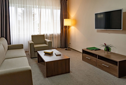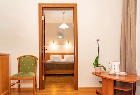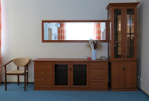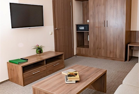 В номере: вешалка, диван, зеркало, комод, кровати односпальные /одна двуспальная кровать, прикроватные тумбочки, стол, столик туалетный, стулья, тумба багажная, шкаф, кондиционер, мини-холодильник, набор посуды, плита электрическая, сейф, телевизор, телефон, электрочайник