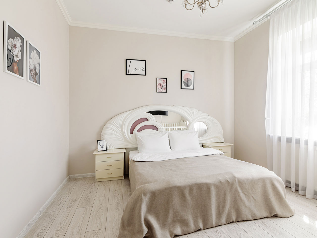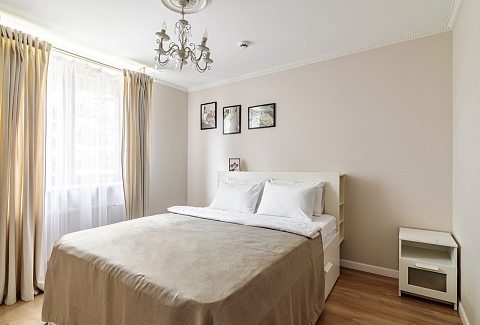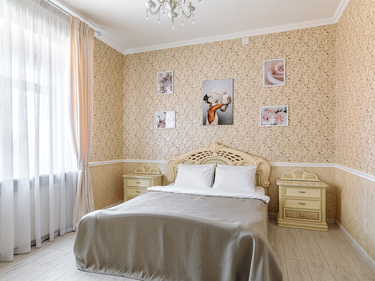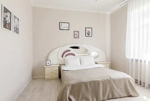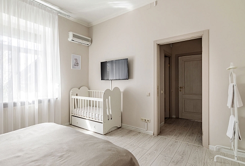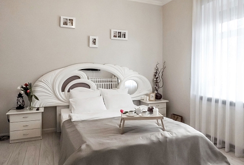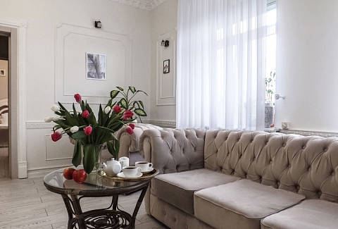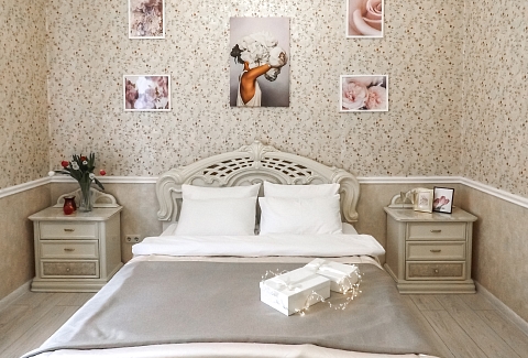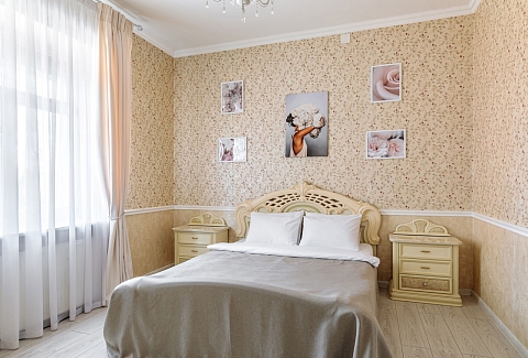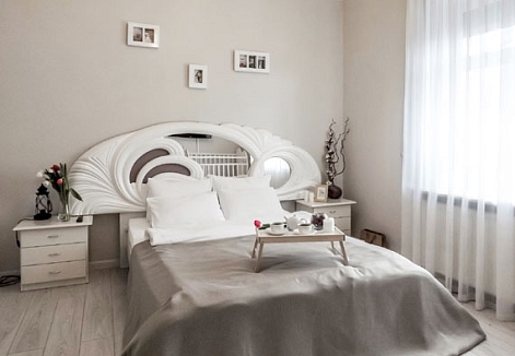 В номере: вешалка, диван, кресла, кровать двуспальная, прикроватные тумбочки, стол, стулья, тумба, шкаф, гладильная доска, духовой шкаф, кондиционер, микроволновая печь, набор посуды, плита электрическая, стиральная машина, телевизор ЖК, утюг, холодильник, чайный набор посуды, электрочайник