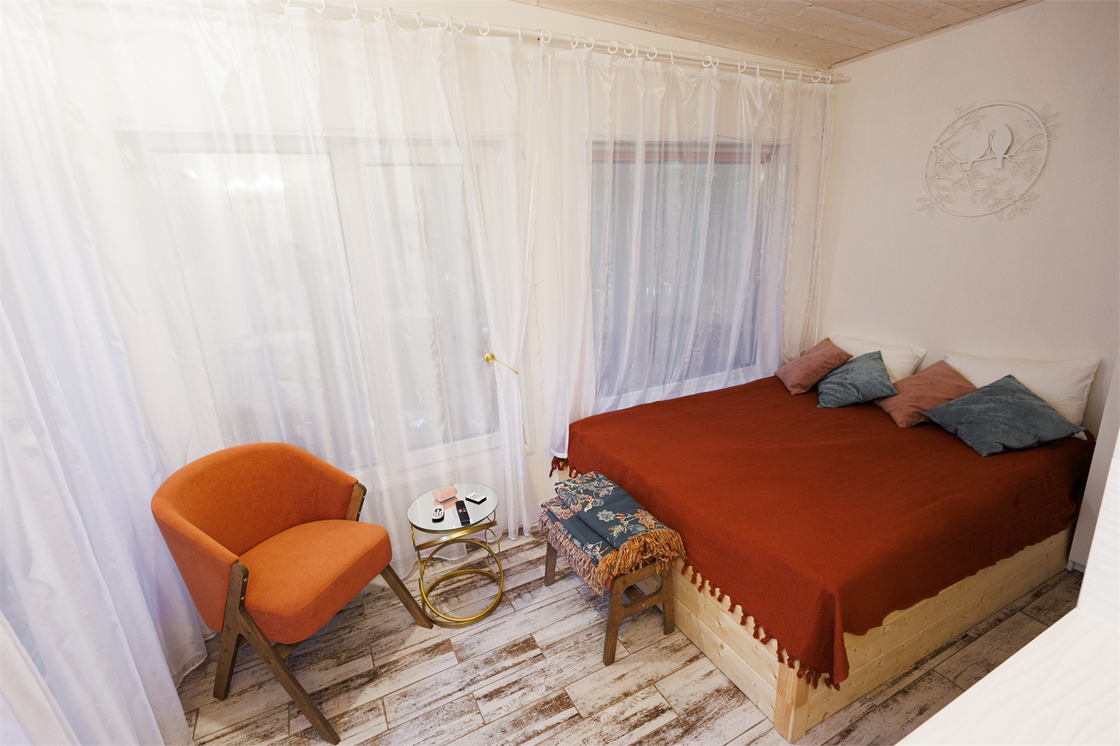 В номере: диван, зеркало, кровать двуспальная, стол, стулья, шкаф, микроволновая печь, мини-холодильник, набор посуды, телевизор ЖК, чайный набор посуды, электрочайник