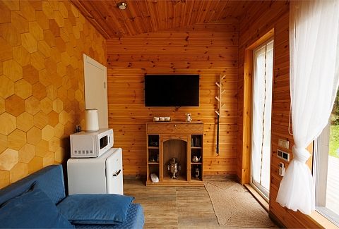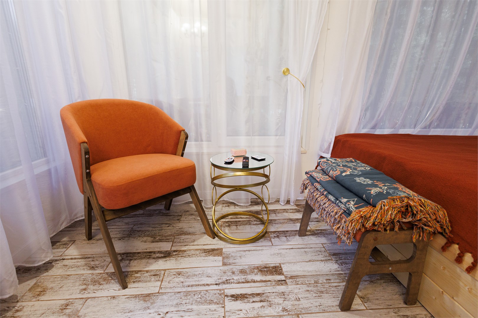 В номере: диван, зеркало, кровать двуспальная, стол, стулья, шкаф, микроволновая печь, мини-холодильник, телевизор ЖК, чайный набор посуды, электрочайник