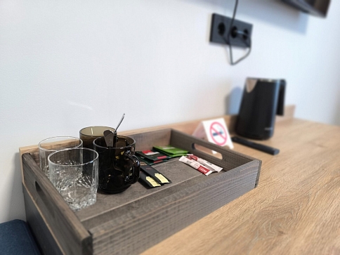 В номере: диван, зеркало, кровать двуспальная, прикроватные тумбочки, стол, стул, шкаф, мини-холодильник, телевизор ЖК, чайный набор посуды, электрочайник