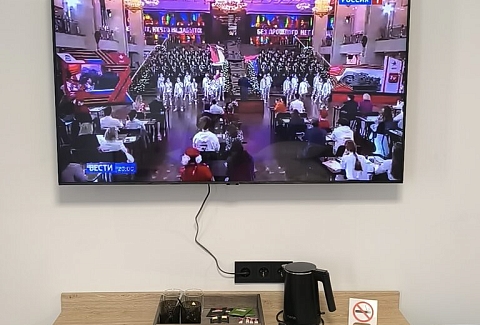 В номере: диван, зеркало, кровать двуспальная, стол, стулья, шкаф, мини-холодильник, телевизор ЖК, чайный набор посуды, электрочайник