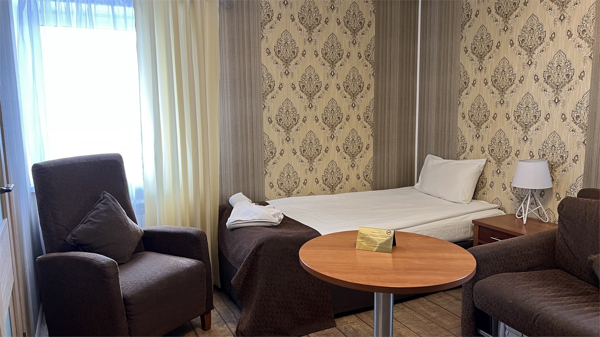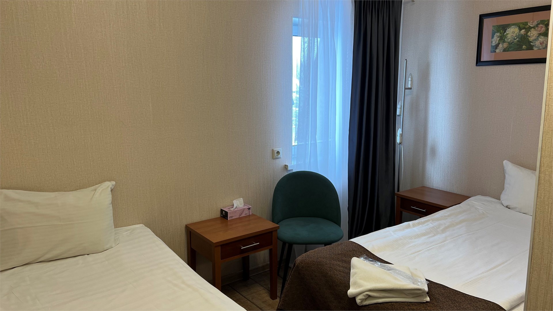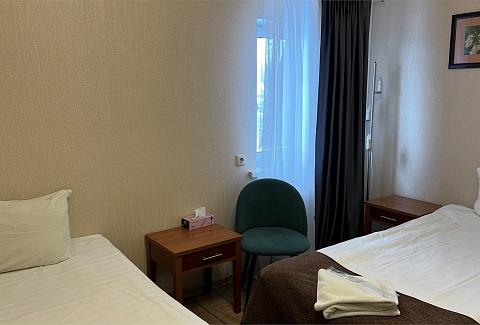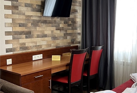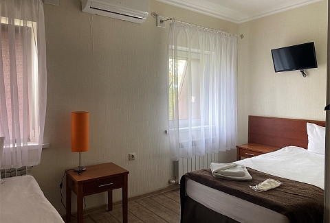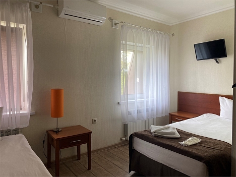 В номере: зеркало, кровать двуспальная, кровать односпальная, стол, стул, шкаф, кондиционер, телевизор ЖК