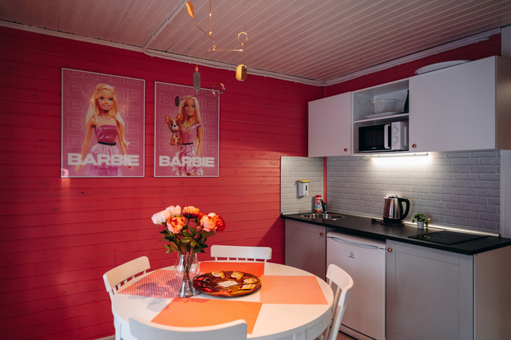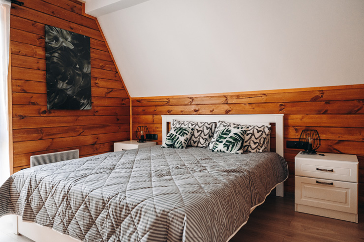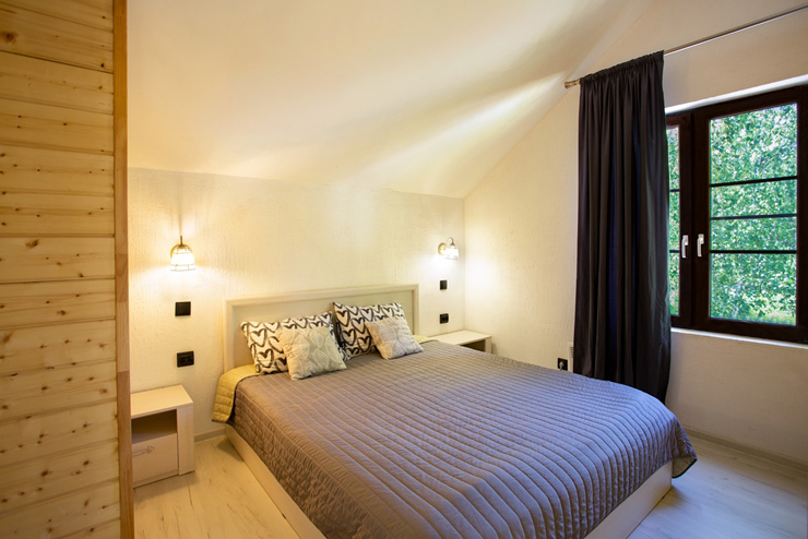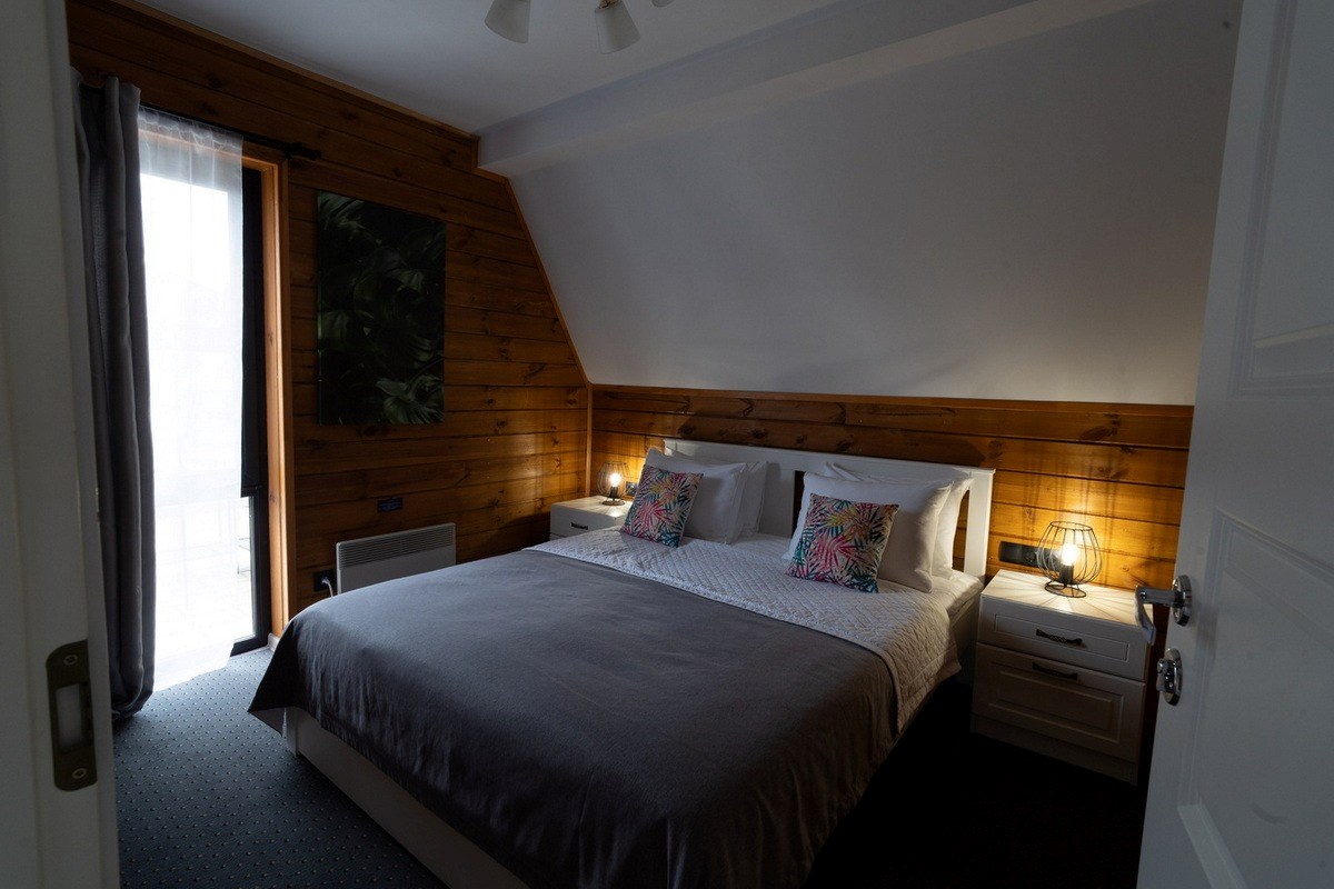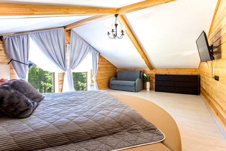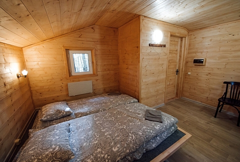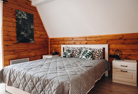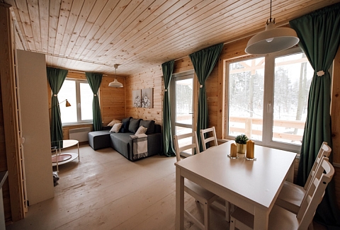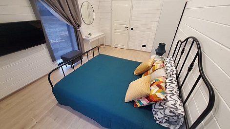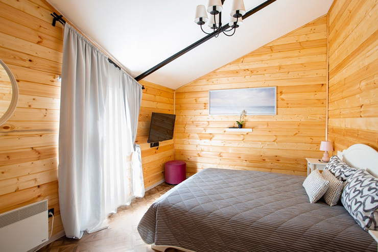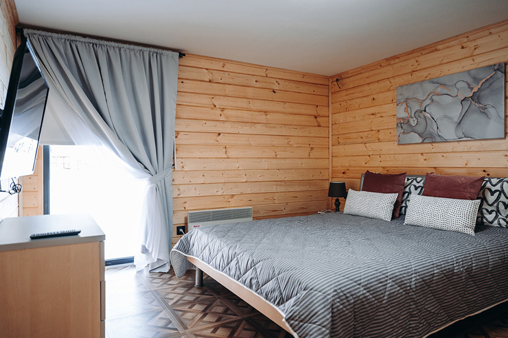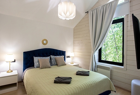 В номере: диван раскладной, зеркало, кровати односпальные, кровать двуспальная, стол, стулья, шкаф для посуды, камин, кондиционер, микроволновая печь, набор посуды, плита электрическая, телевизор ЖК, холодильник, чайный набор посуды, электрочайник