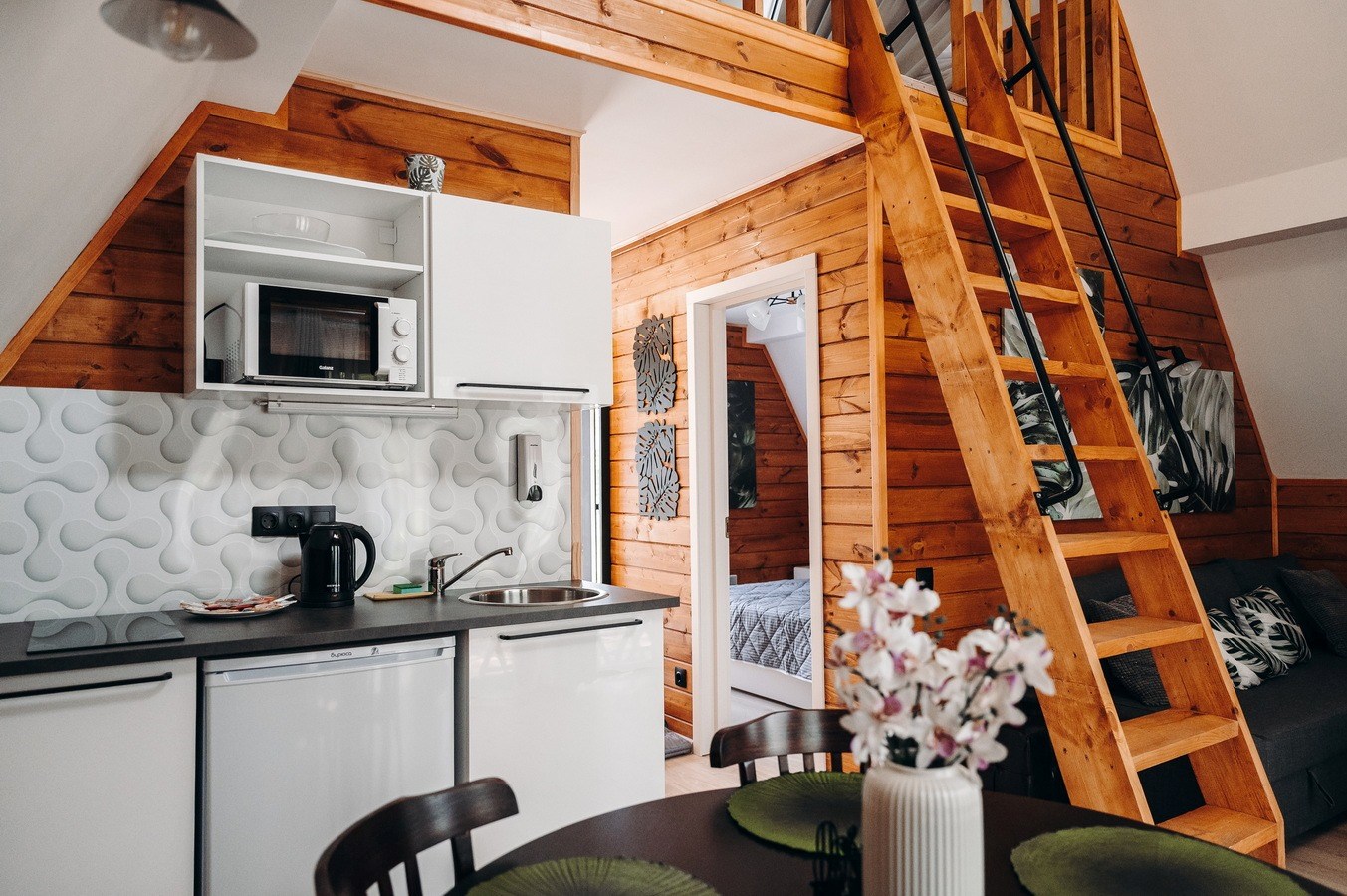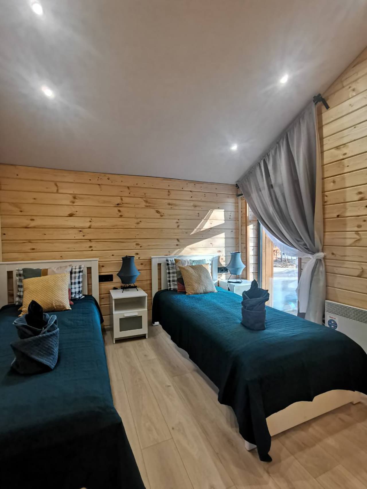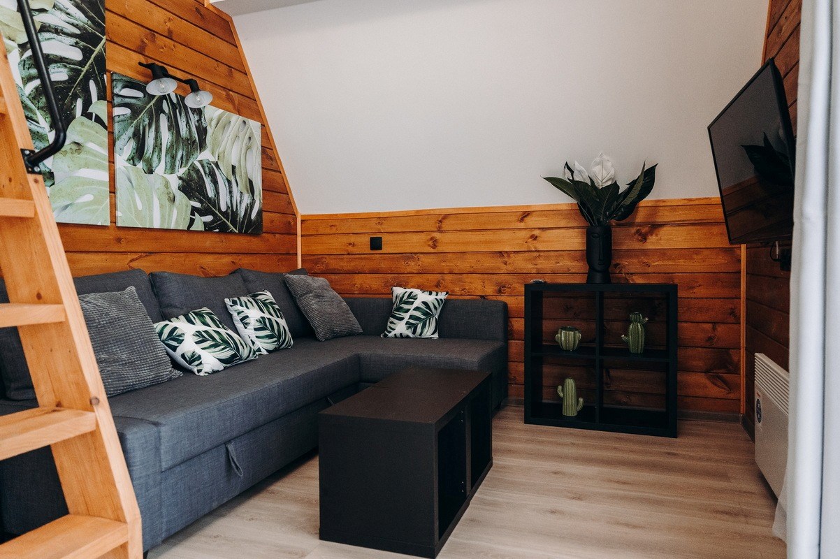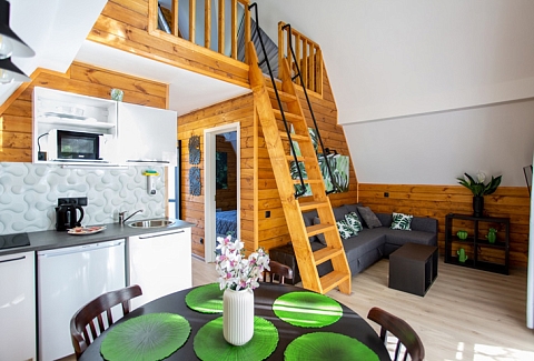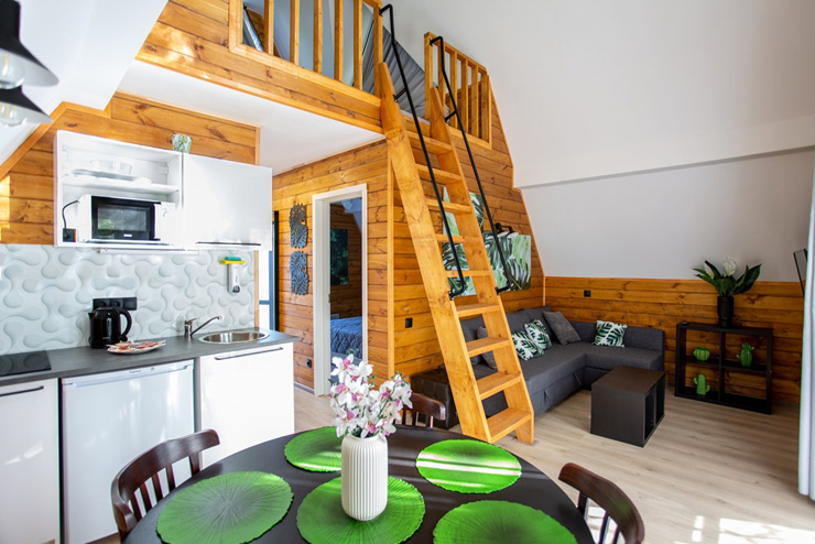 В номере: диван раскладной, зеркало, кровати односпальные, кровать двуспальная, стол, стулья, шкаф для посуды, камин, кондиционер, микроволновая печь, набор посуды, плита электрическая, телевизор ЖК, холодильник, чайный набор посуды, электрочайник