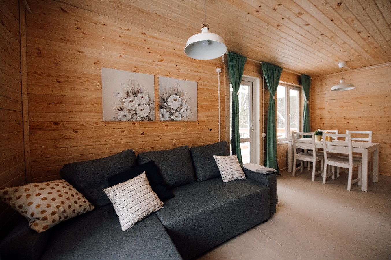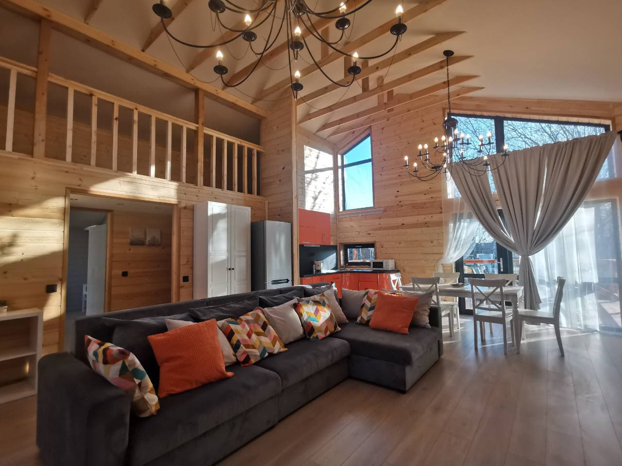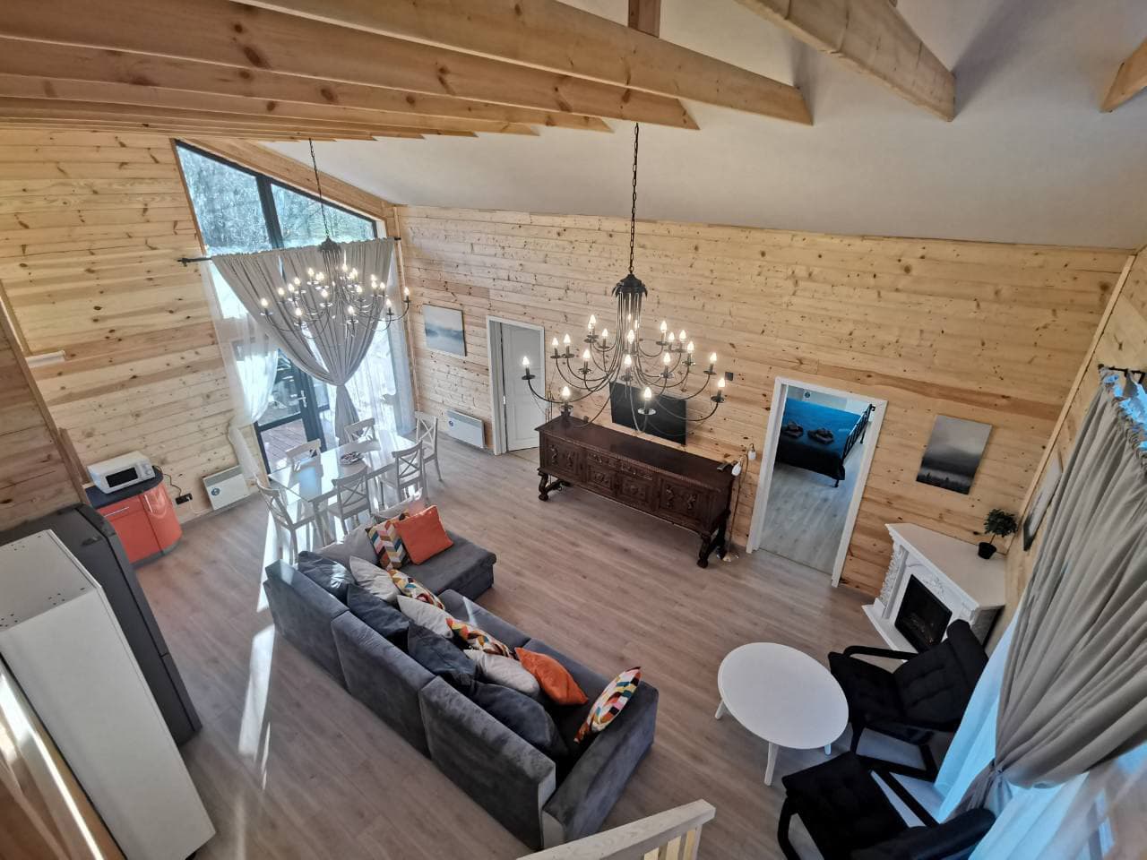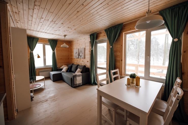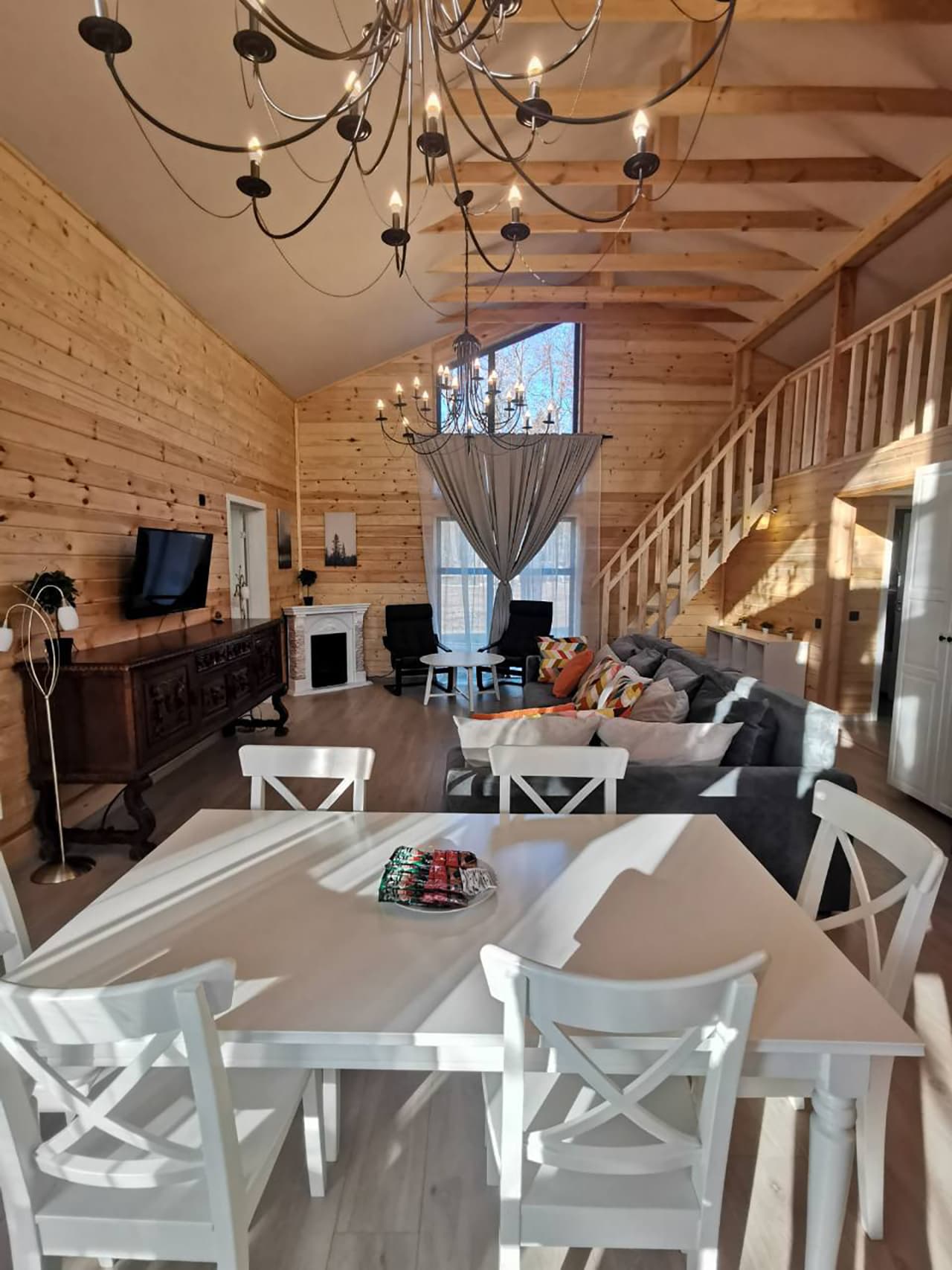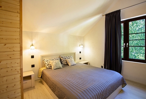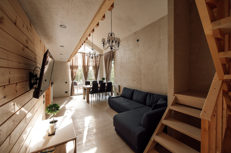 В номере: диван раскладной, кровати односпальные, кровать двуспальная, стол, стулья, шкаф, камин, кондиционер, микроволновая печь, набор посуды, плита электрическая, телевизор ЖК, холодильник, чайный набор посуды, электрочайник
