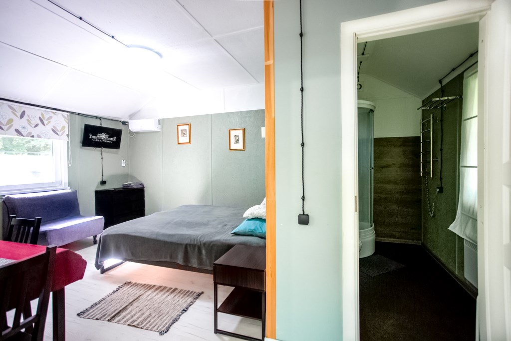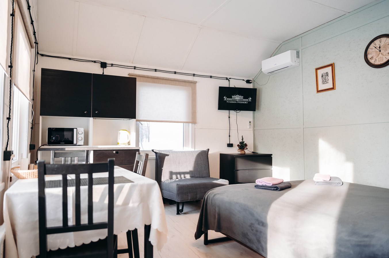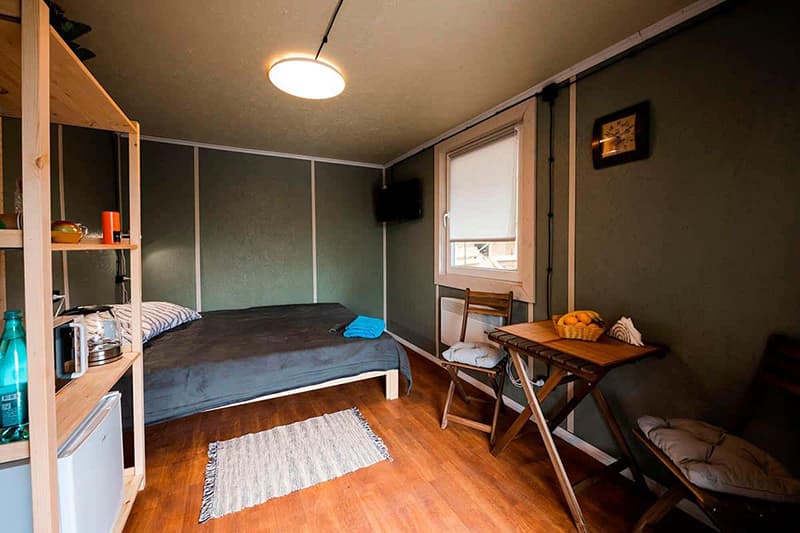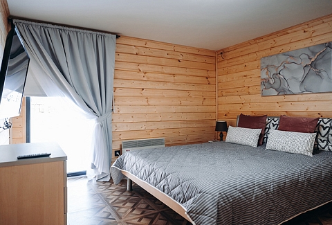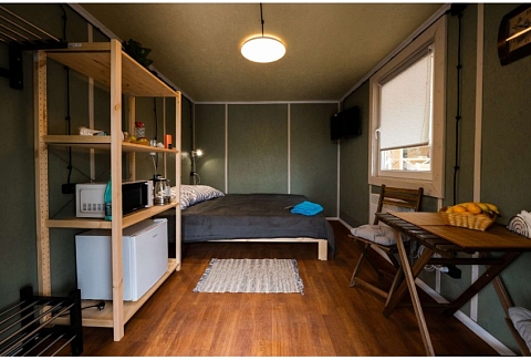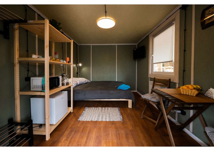 В номере: кресло-кровать, кровать двуспальная, стол, стулья, кондиционер, микроволновая печь, мини-холодильник, телевизор ЖК, электрочайник