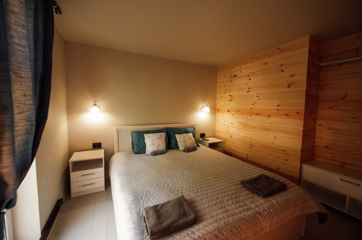 В номере: диван раскладной, зеркало, кровати односпальные, кровать двуспальная, прикроватные тумбочки, стол, стулья, микроволновая печь, мини-холодильник, набор посуды, плита электрическая, телевизор ЖК, электрочайник