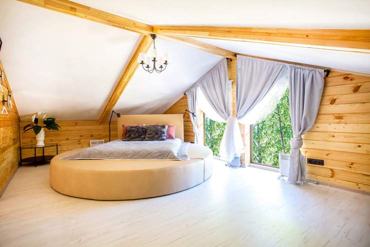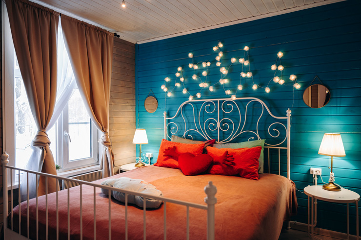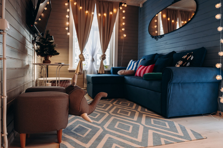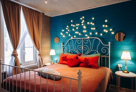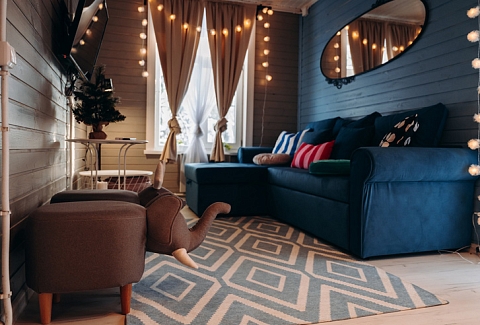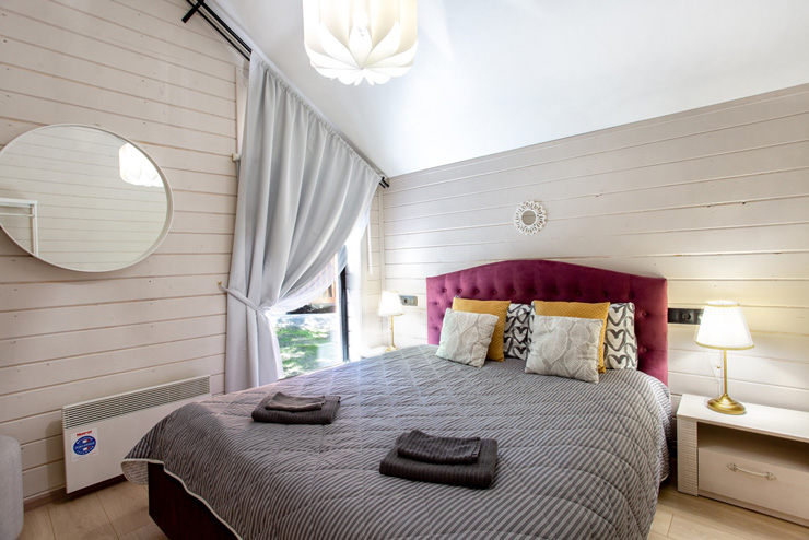 В номере: диван, диван раскладной, зеркало, комод, кровать двуспальная, прикроватные тумбочки, стол, стулья, шкаф, камин, кондиционер, микроволновая печь, набор посуды, плита электрическая, телевизор ЖК, холодильник, электрочайник