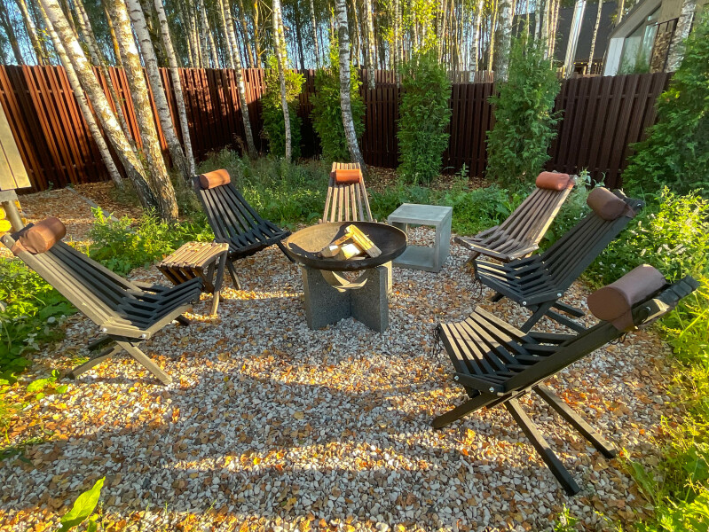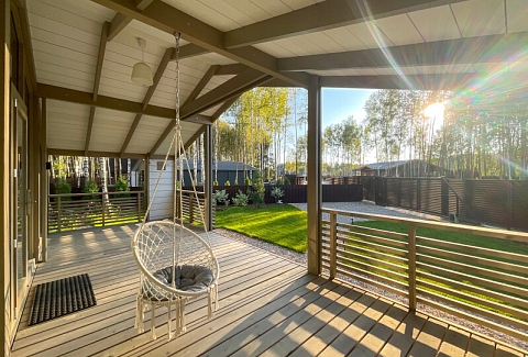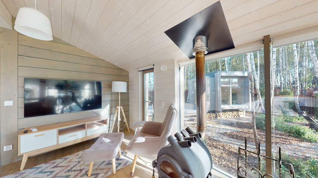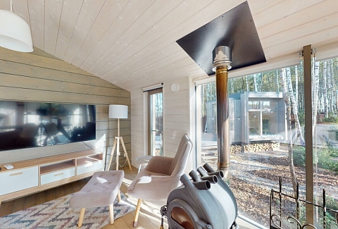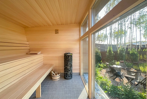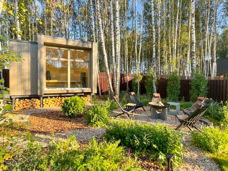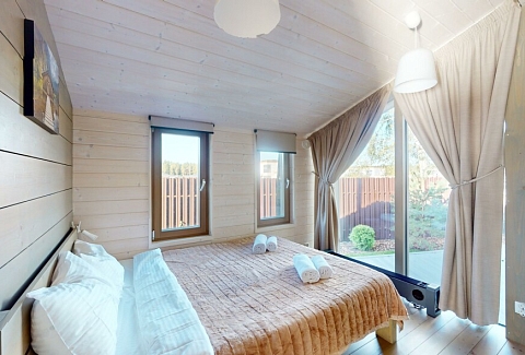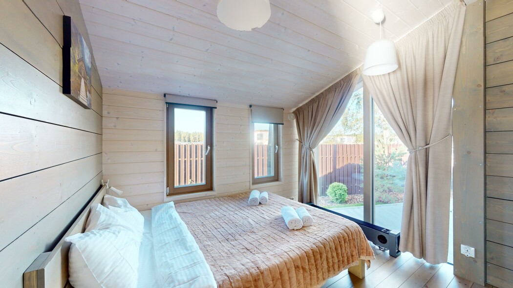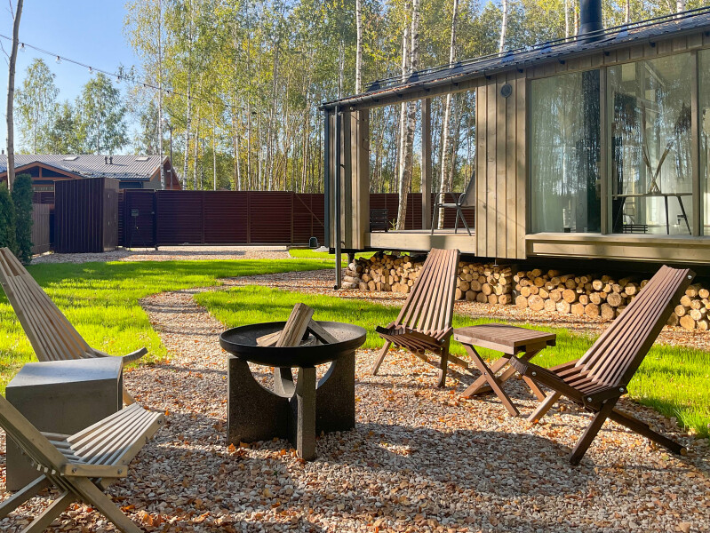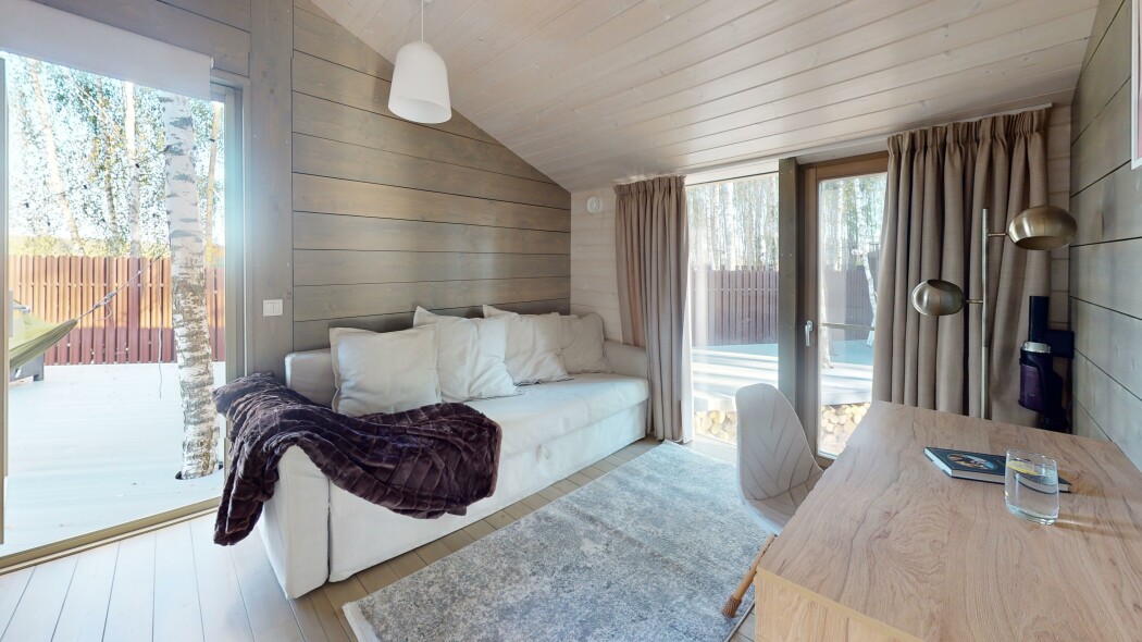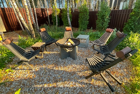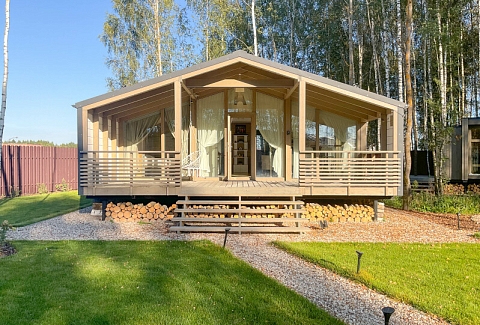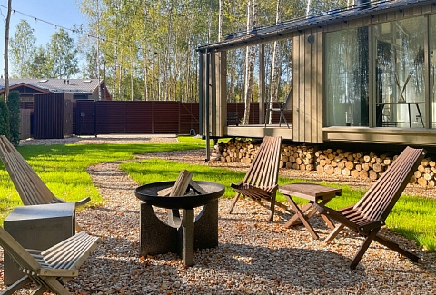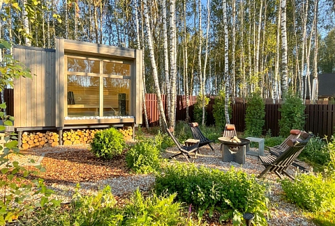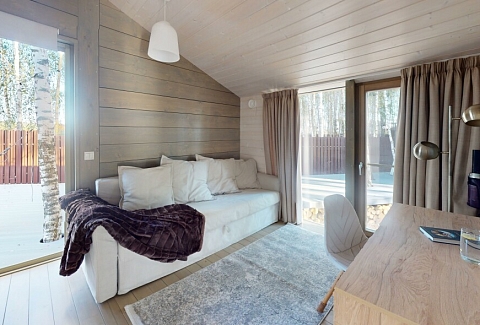 В качестве спальных мест в каждом предусмотрены удобные кровати и диван. Кухни укомплектованы всем, что может пригодиться при самостоятельной готовке, включая посудомоечную и кофемашину. Дополнительный уют создает камин. К домам примыкает открытая терраса с летней мебелью, гамаком, плетеным креслом. На территории предусмотрено все для отдыха: кресла-шезлонги, подвесные качели. Костровую чашу можно использовать как мангал, шампуры и решетка предоставляются. В каждом коттедже — собственная видовая сауна с банными принадлежностями, один дополнен купелью. Проживающие могут воспользоваться станицей «Алиса» и Wi-Fi. Разрешено заселение с питомцем небольшой породы. Во дворе выделено место для стоянки 2 машин, оборудованное видеонаблюдением.