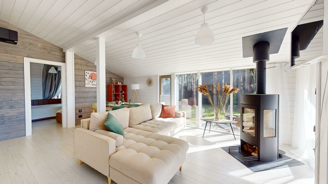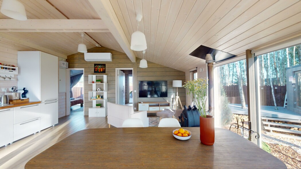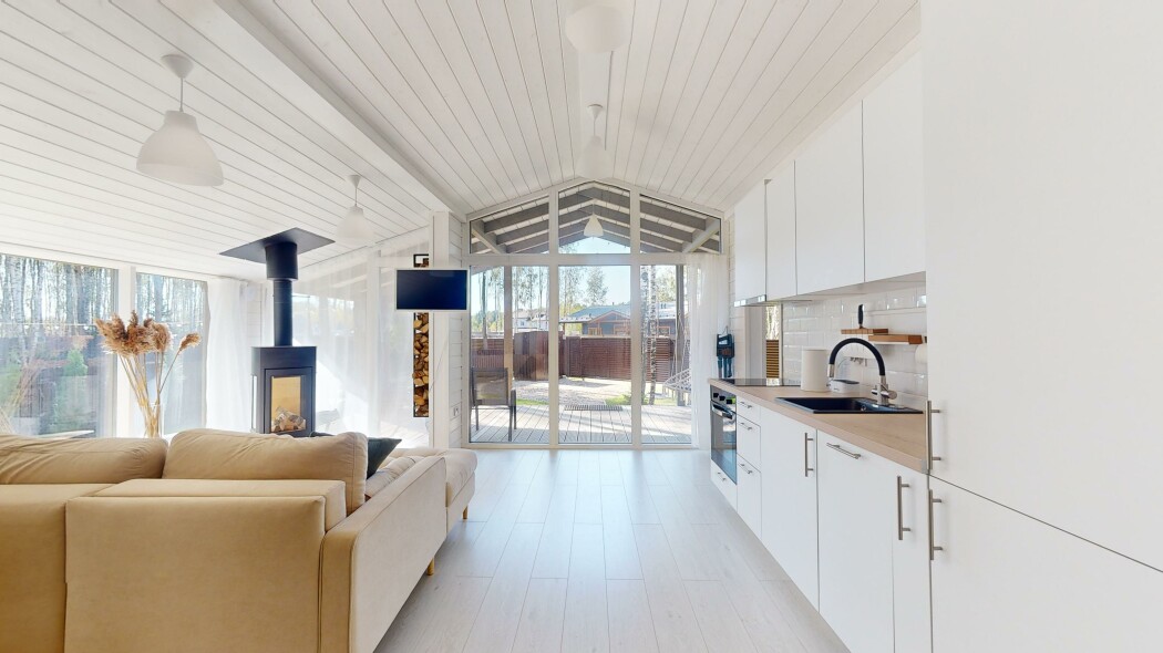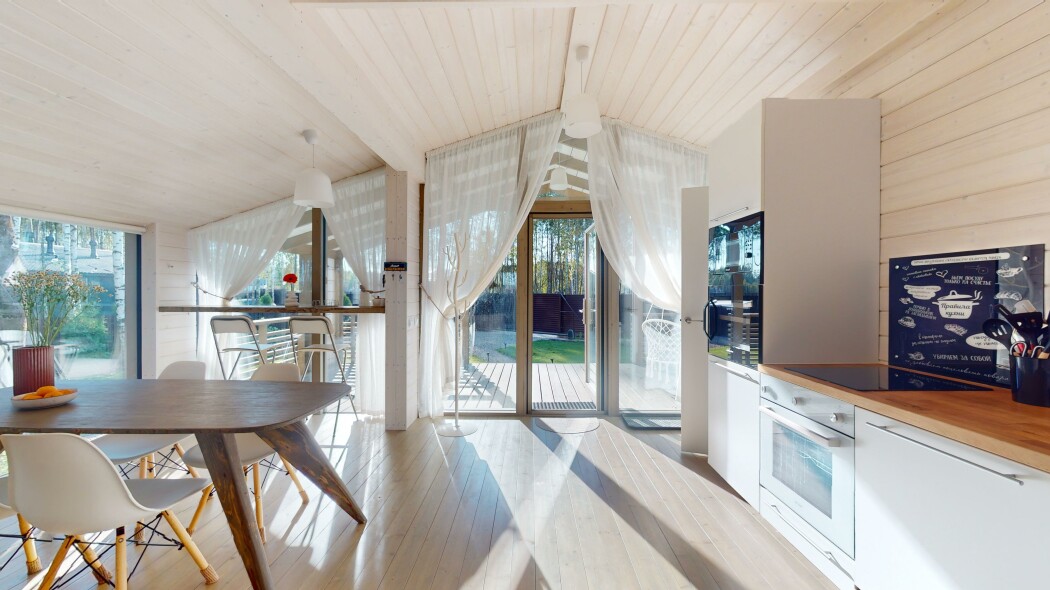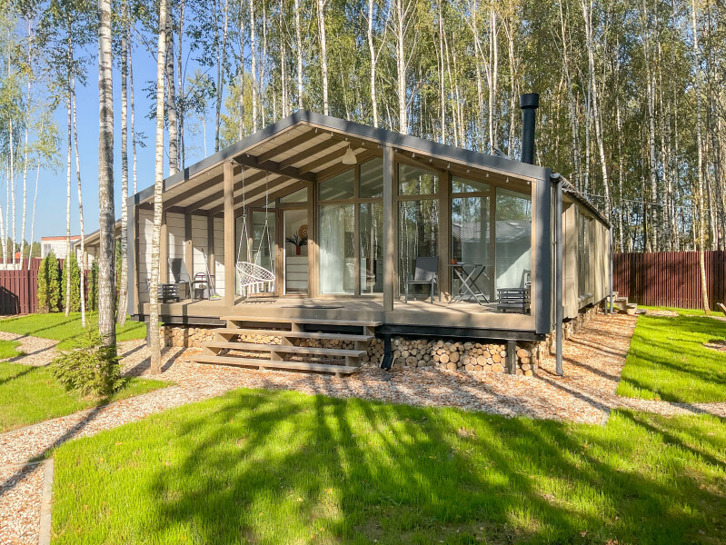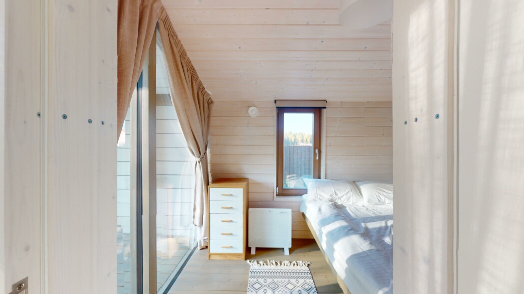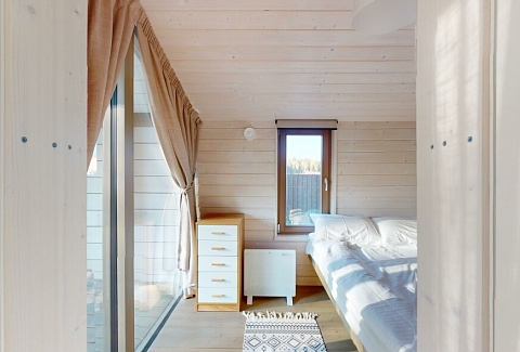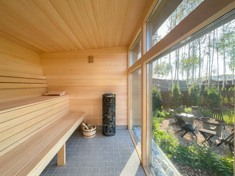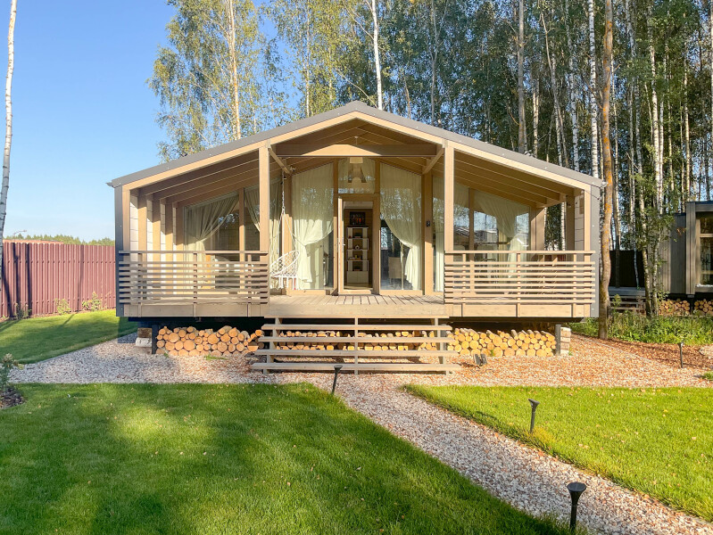 В качестве спальных мест в каждом предусмотрены удобные кровати и диван. Кухни укомплектованы всем, что может пригодиться при самостоятельной готовке, включая посудомоечную и кофемашину. Дополнительный уют создает камин. К домам примыкает открытая терраса с летней мебелью, гамаком, плетеным креслом. На территории предусмотрено все для отдыха: кресла-шезлонги, подвесные качели. Костровую чашу можно использовать как мангал, шампуры и решетка предоставляются. В каждом коттедже — собственная видовая сауна с банными принадлежностями, один дополнен купелью. Проживающие могут воспользоваться станицей «Алиса» и Wi-Fi. Разрешено заселение с питомцем небольшой породы. Во дворе выделено место для стоянки 2 машин, оборудованное видеонаблюдением.