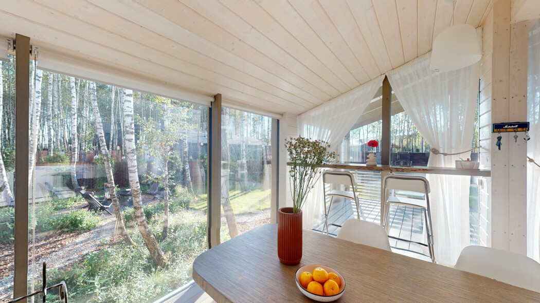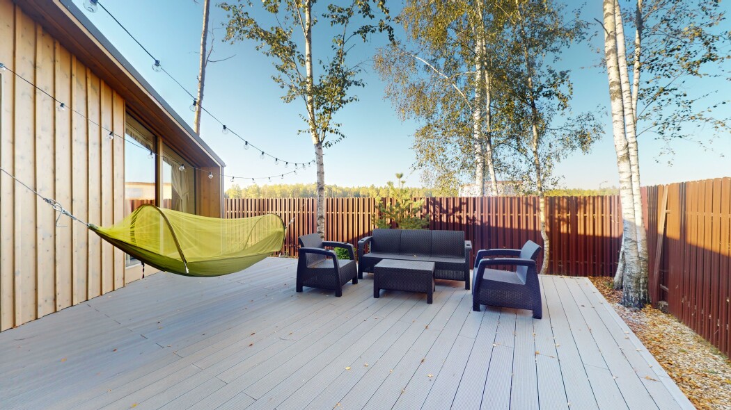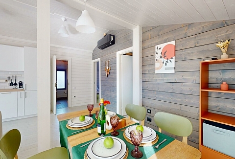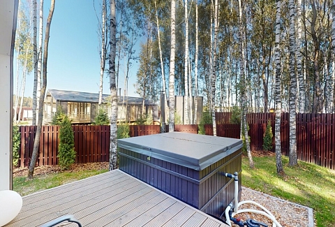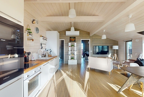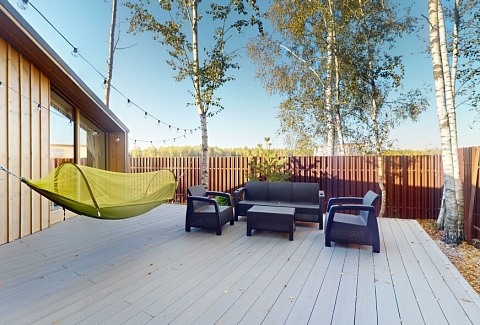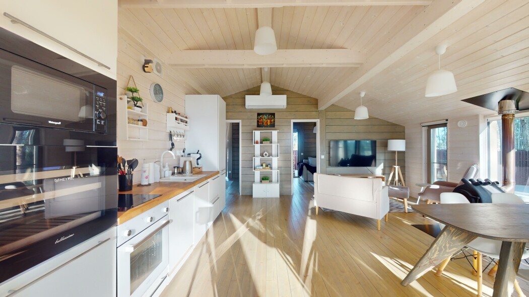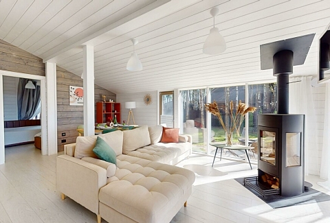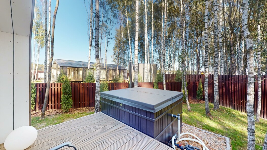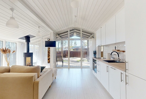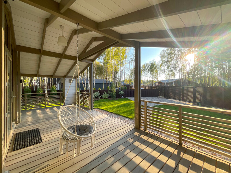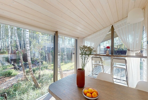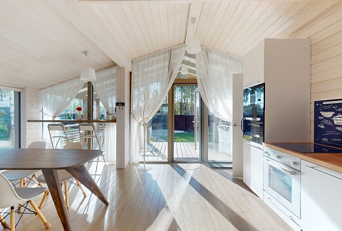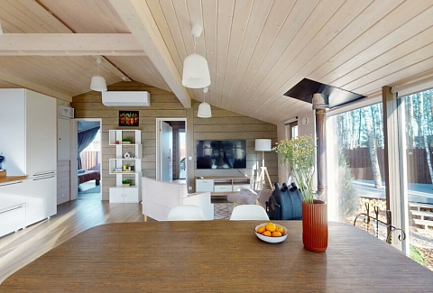 В качестве спальных мест в каждом предусмотрены удобные кровати и диван. Кухни укомплектованы всем, что может пригодиться при самостоятельной готовке, включая посудомоечную и кофемашину. Дополнительный уют создает камин. К домам примыкает открытая терраса с летней мебелью, гамаком, плетеным креслом. На территории предусмотрено все для отдыха: кресла-шезлонги, подвесные качели. Костровую чашу можно использовать как мангал, шампуры и решетка предоставляются. В каждом коттедже — собственная видовая сауна с банными принадлежностями, один дополнен купелью. Проживающие могут воспользоваться станицей «Алиса» и Wi-Fi. Разрешено заселение с питомцем небольшой породы. Во дворе выделено место для стоянки 2 машин, оборудованное видеонаблюдением.