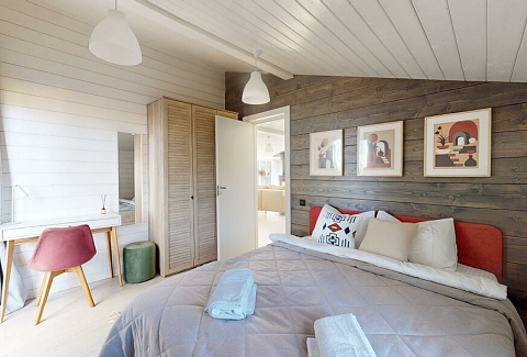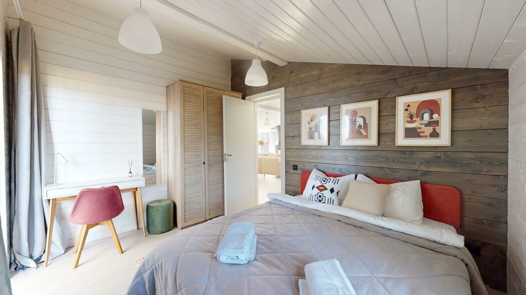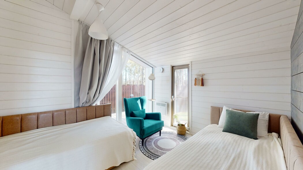 В номере: вешалка, диван, зеркало, кровати односпальные, кровать двуспальная, прикроватные тумбочки, стол, стулья, шкаф, гладильная доска, духовой шкаф, камин, кондиционер, кофемашина, микроволновая печь, набор посуды, плита электрическая, стиральная машина, сушилка для белья, телевизор ЖК, умная колонка, утюг, холодильник, чайный набор посуды, электрочайник