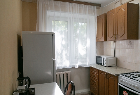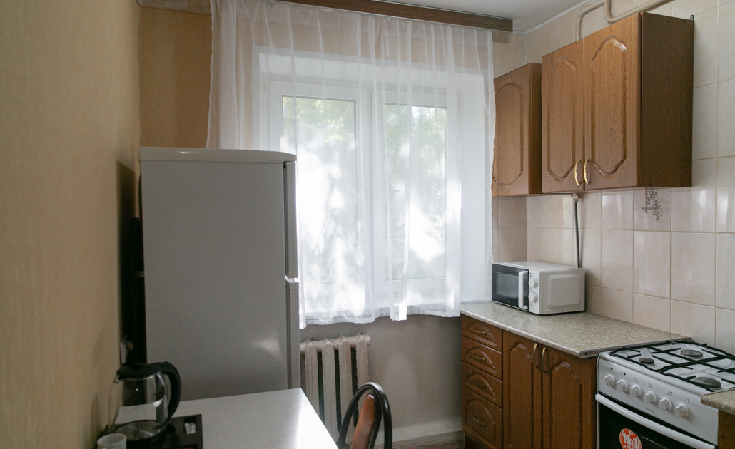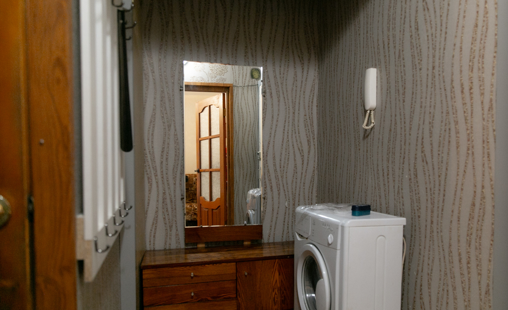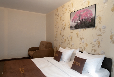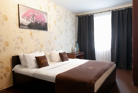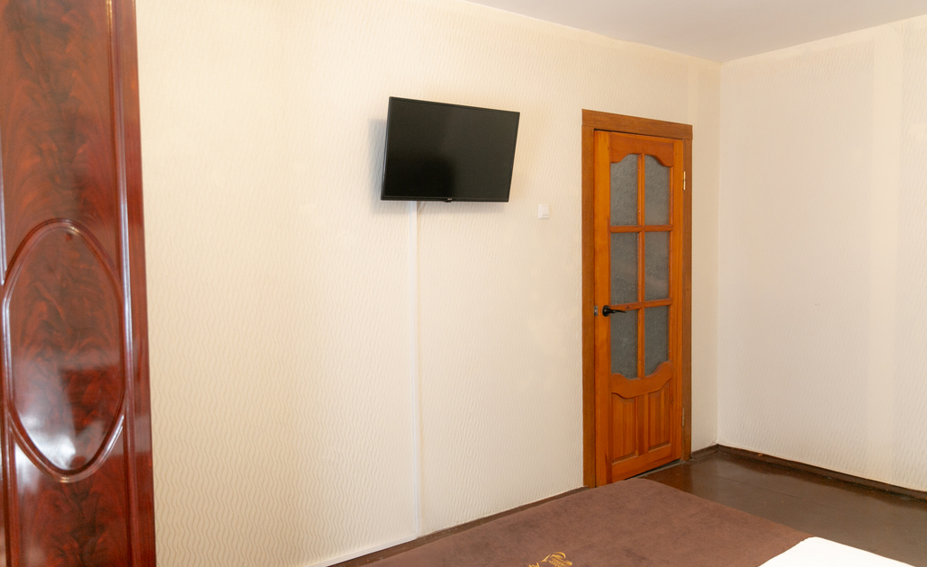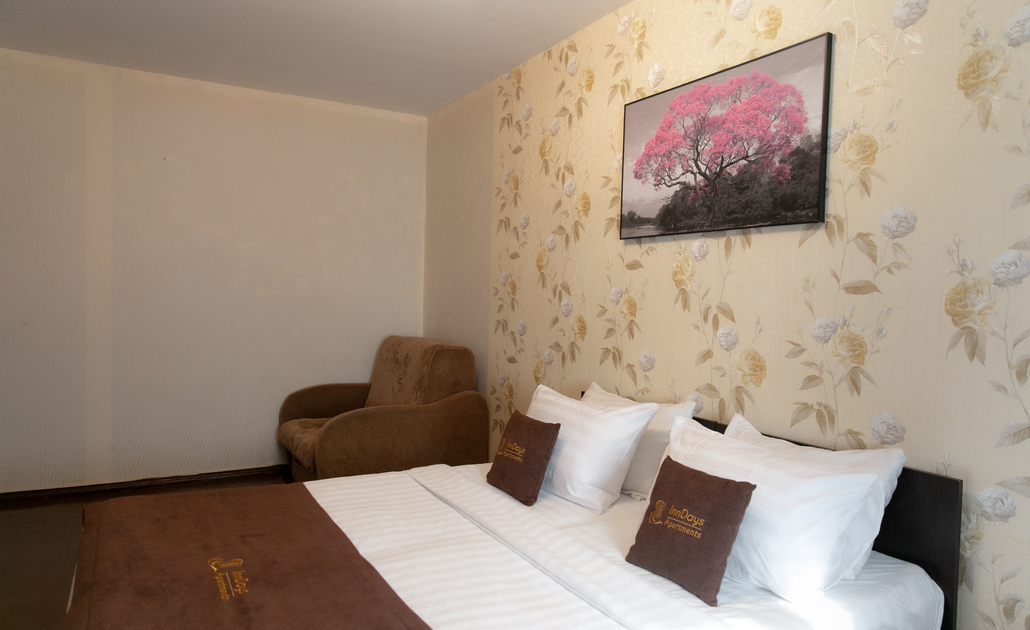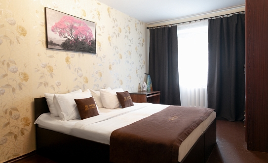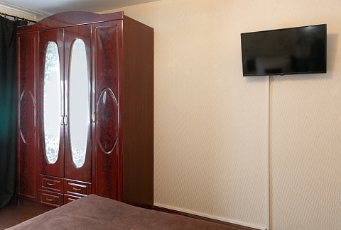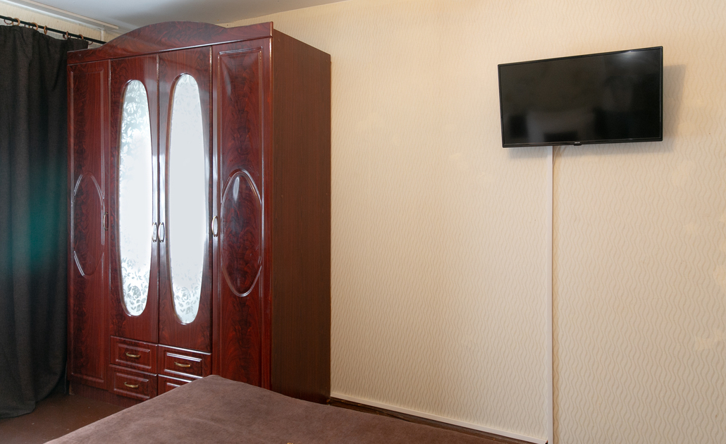 В номере: вешалка, зеркало, кресло, кровать двуспальная, стол, стулья, шкаф, духовой шкаф, микроволновая печь, набор посуды, плита электрическая, стиральная машина, телевизор, холодильник, электрочайник
