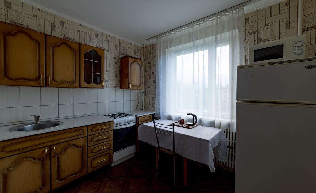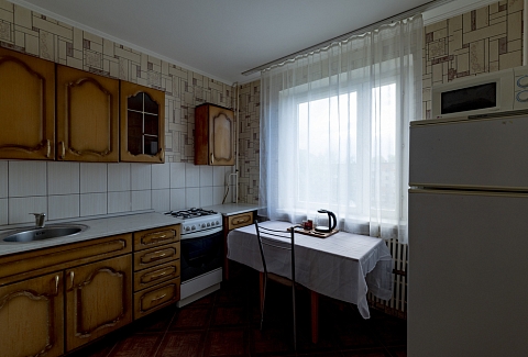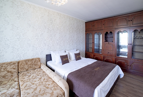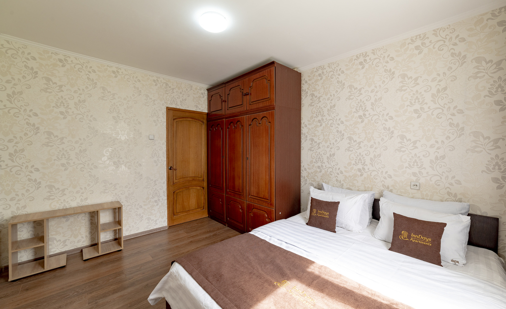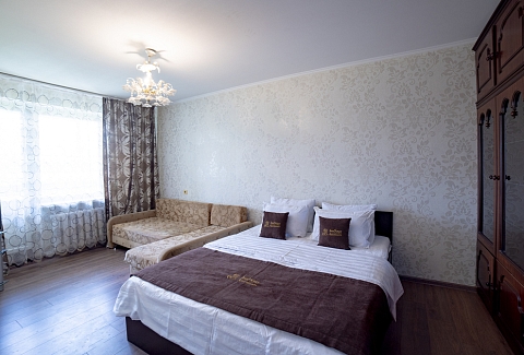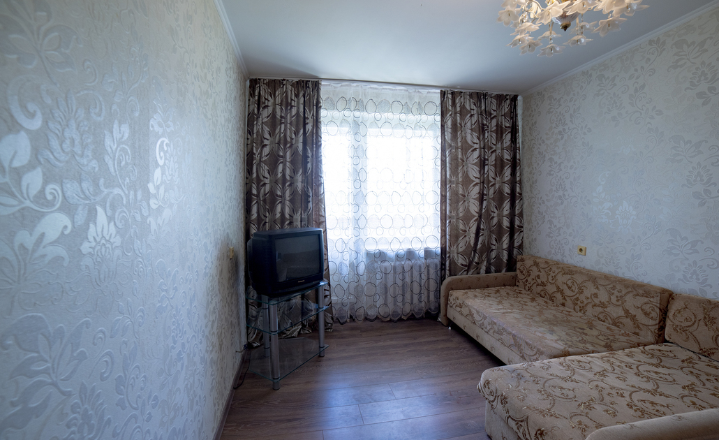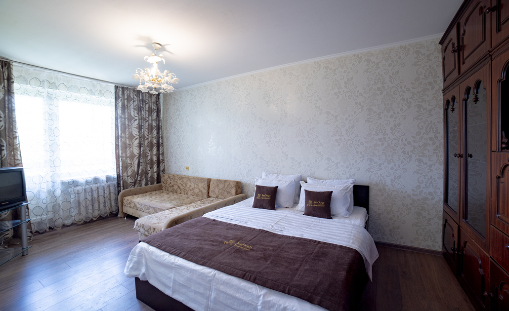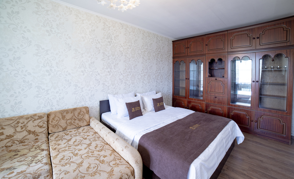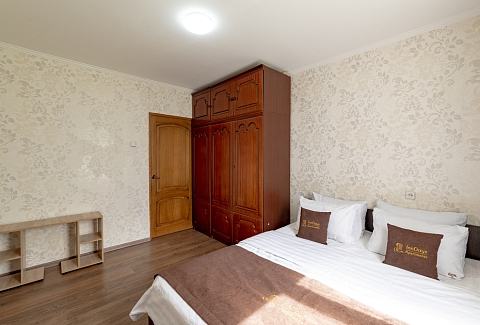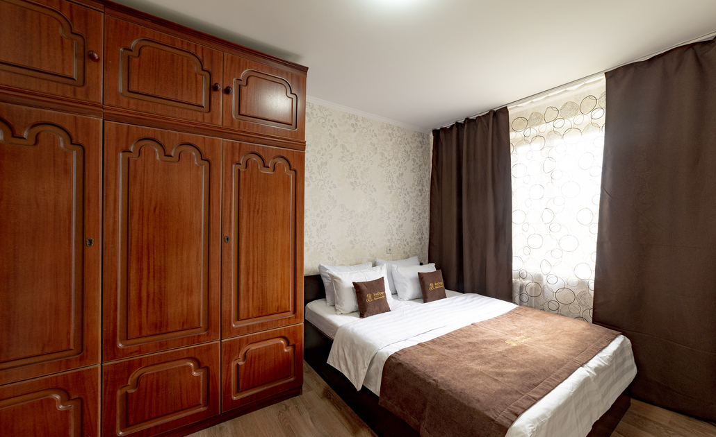 В номере: вешалка, диван, зеркало, кровать двуспальная, стол, стулья, шкаф, духовой шкаф, микроволновая печь, набор посуды, плита электрическая, стиральная машина, телевизор, холодильник, электрочайник