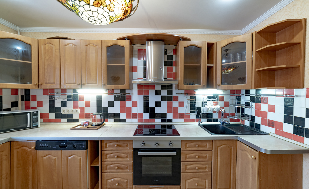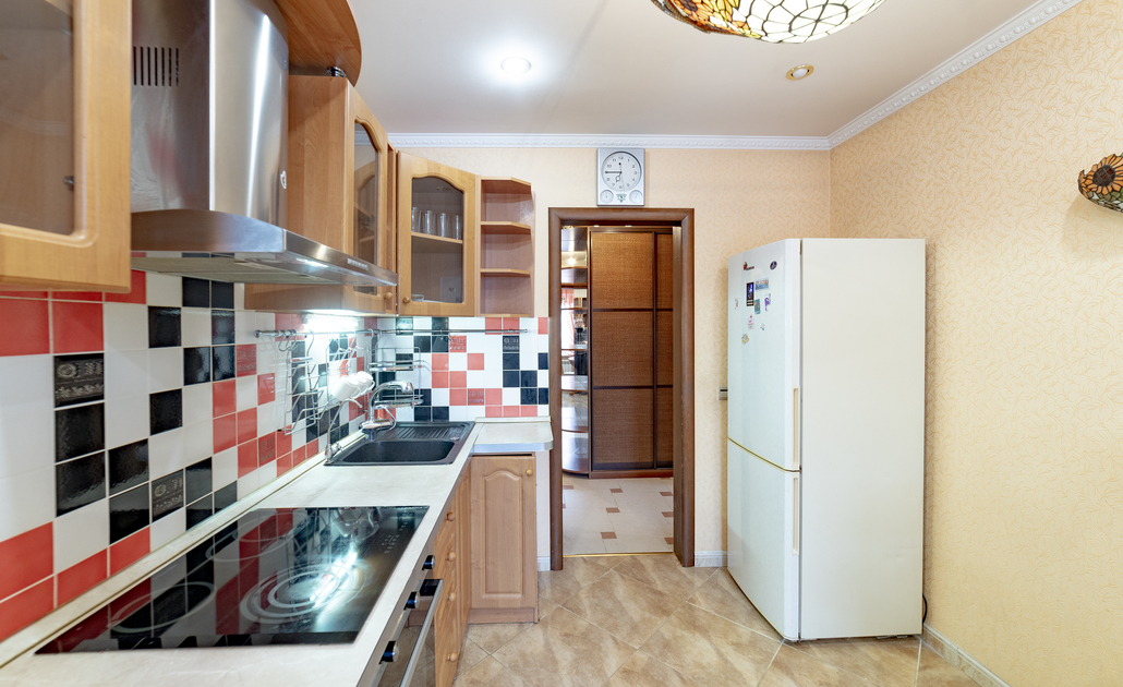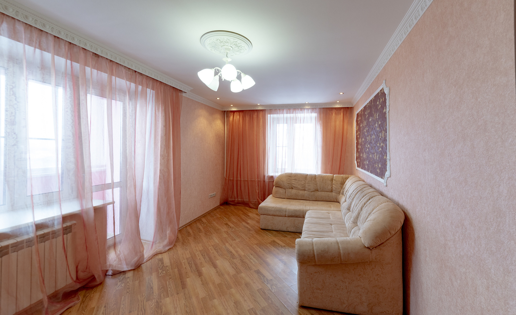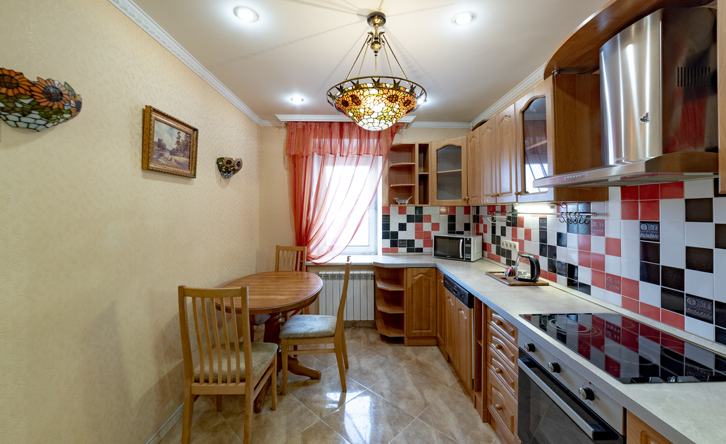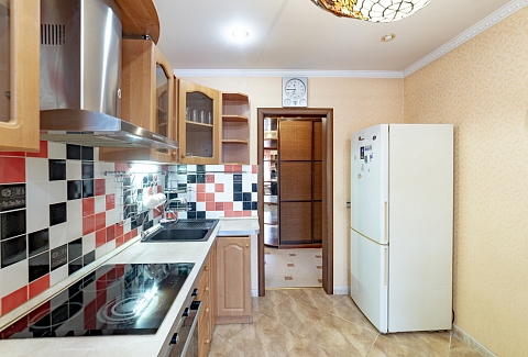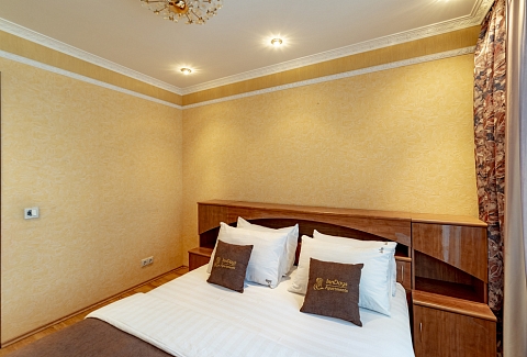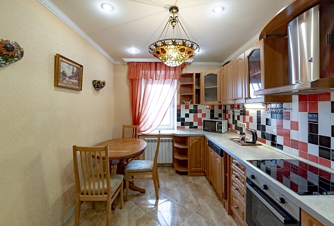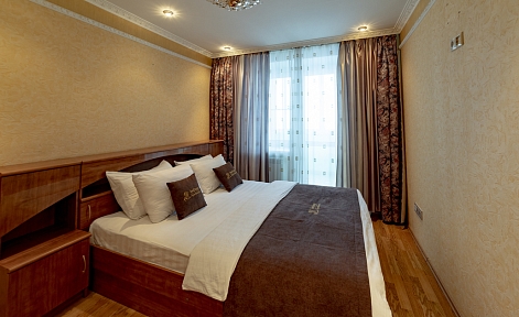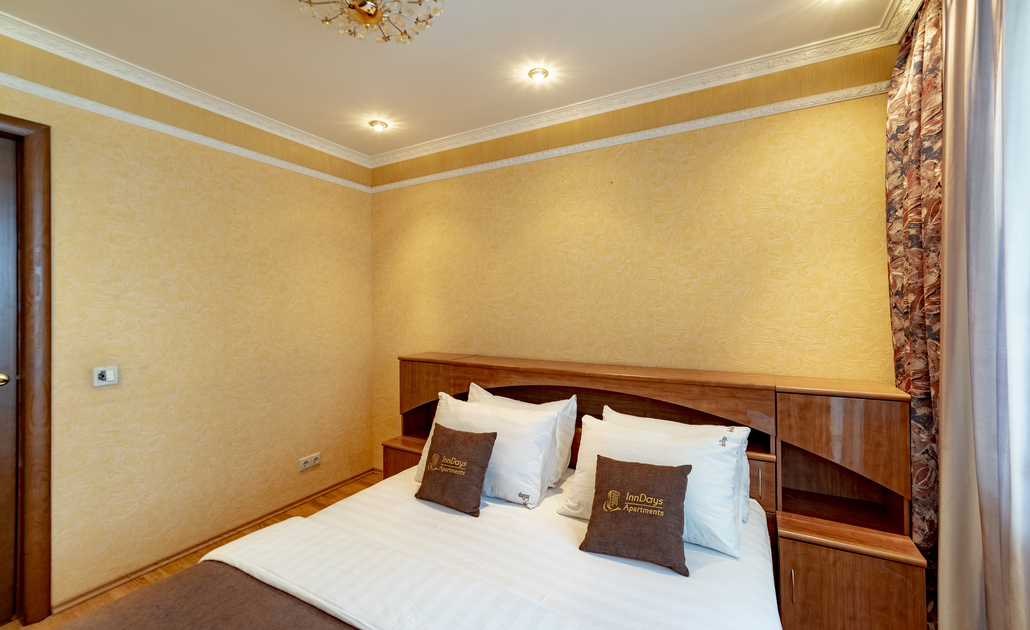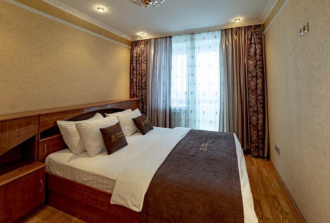 В номере: вешалка, диван, зеркало, кровать двуспальная, прикроватные тумбочки, стол, стулья, шкаф, духовой шкаф, микроволновая печь, набор посуды, плита электрическая, стиральная машина, телевизор, холодильник, электрочайник