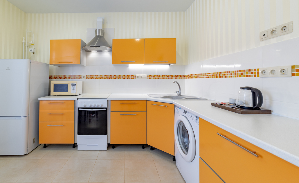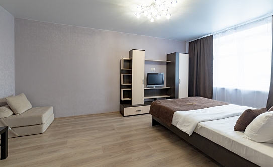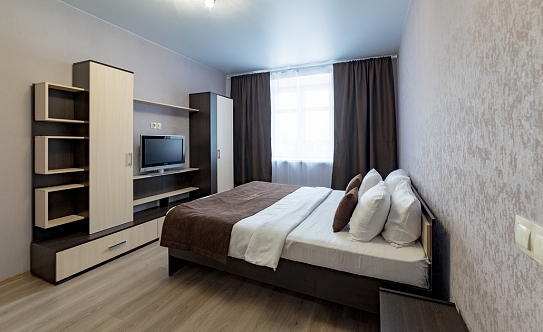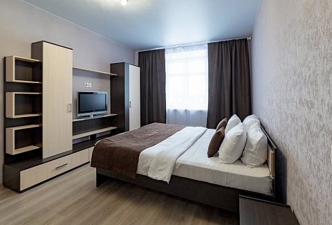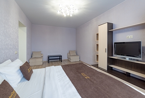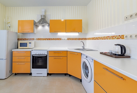 В номере: вешалка, зеркало, кресла, кровать двуспальная, прикроватные тумбочки, стол, стулья, тумба, шкаф, микроволновая печь, набор посуды, плита электрическая, стиральная машина, телевизор, холодильник, электрочайник