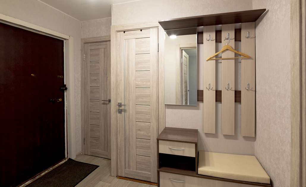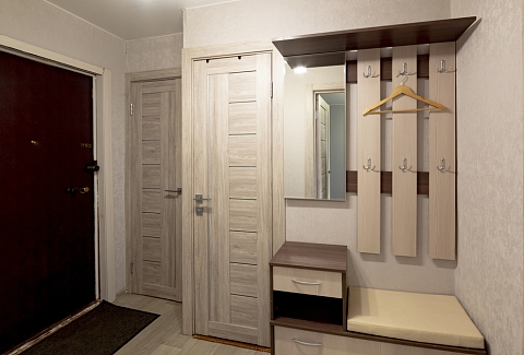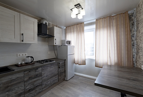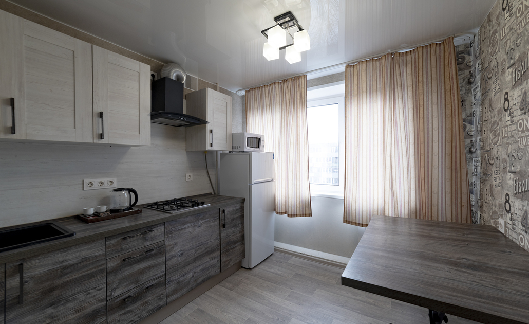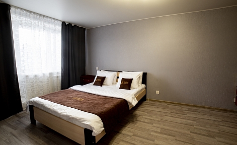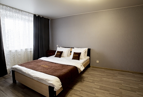В номере: вешалка, диван, зеркало, кровать двуспальная, стол, стулья, шкаф, духовой шкаф, микроволновая печь, набор посуды, плита электрическая, стиральная машина, телевизор, холодильник, электрочайник