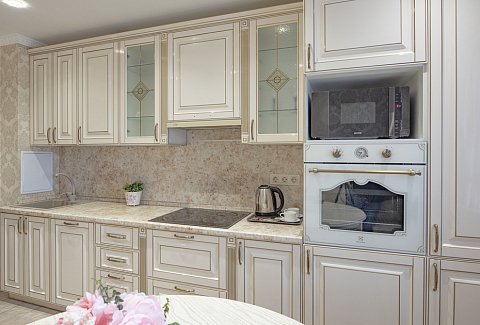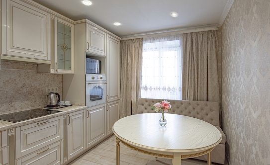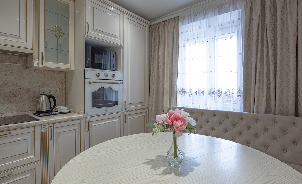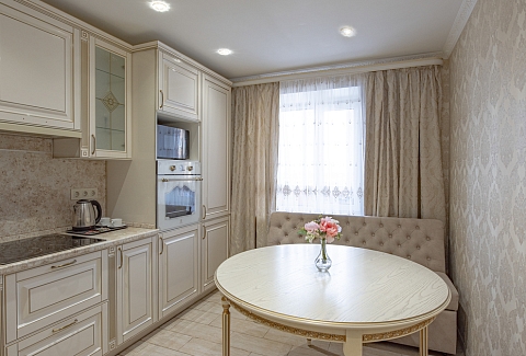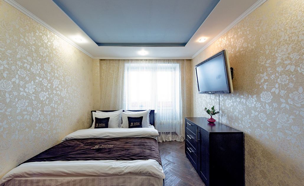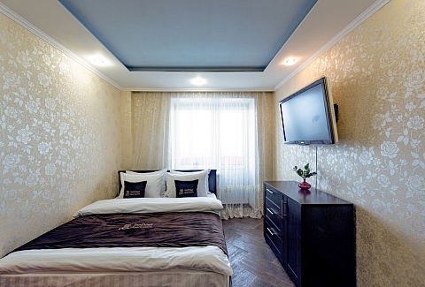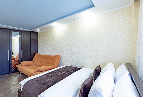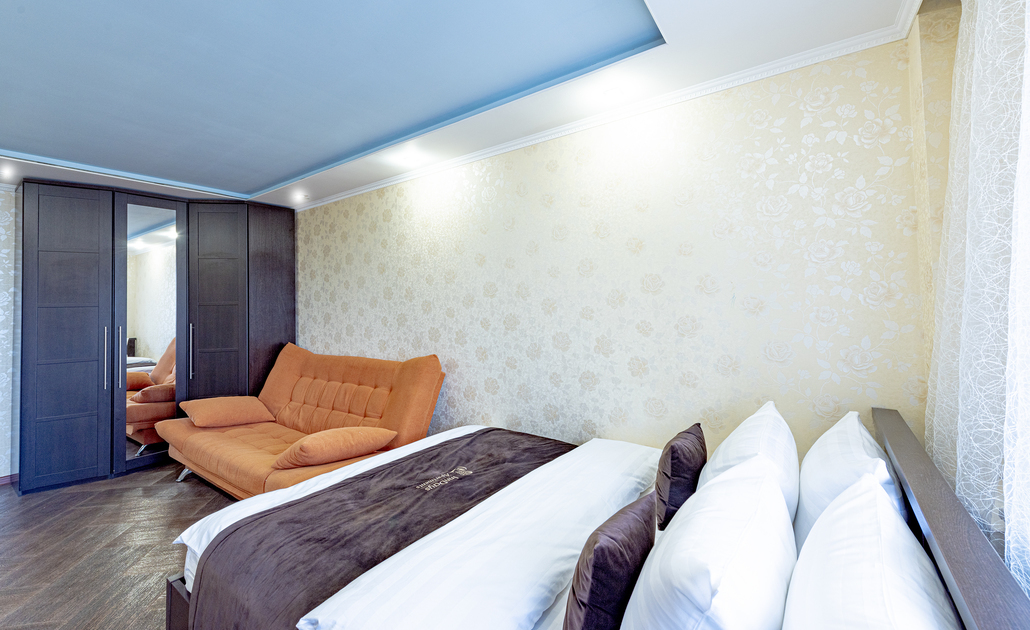 В номере: вешалка, диван, зеркало, кровать двуспальная, стол, стулья, шкаф, духовой шкаф, микроволновая печь, набор посуды, стиральная машина, телевизор, холодильник, электрочайник