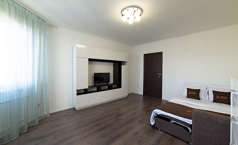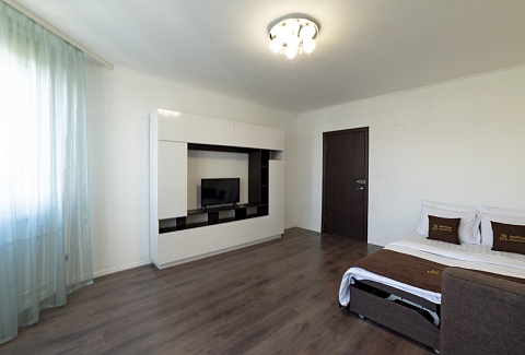 В номере: вешалка, диван, зеркало, кресло, кровать двуспальная, прикроватные тумбочки, стол, стулья, шкаф, духовой шкаф, микроволновая печь, набор посуды, плита электрическая, стиральная машина, телевизор, холодильник, электрочайник