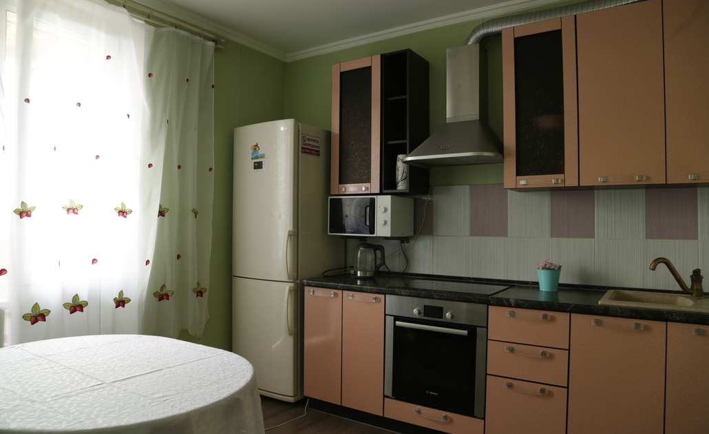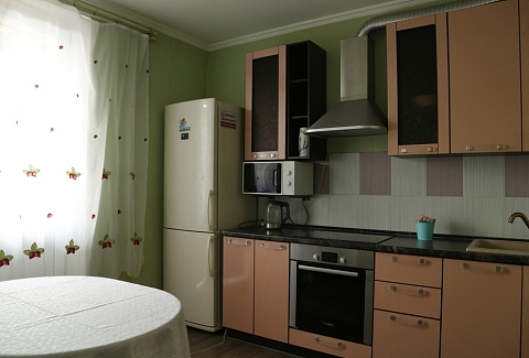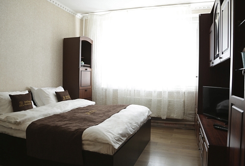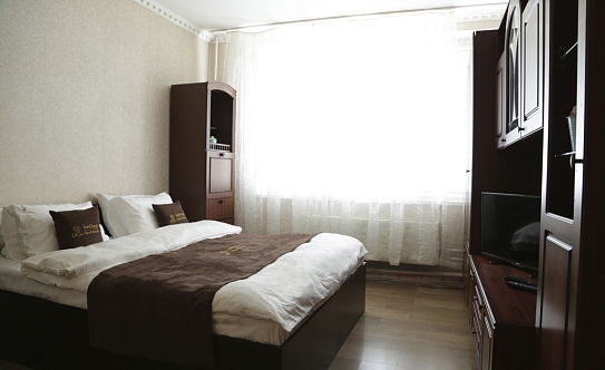 В номере: вешалка, зеркало, кровать двуспальная, стол, стулья, шкаф, духовой шкаф, микроволновая печь, набор посуды, плита электрическая, стиральная машина, телевизор, холодильник, электрочайник