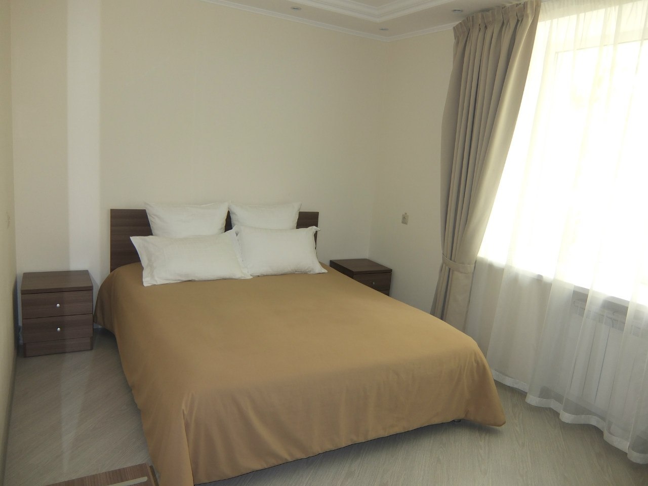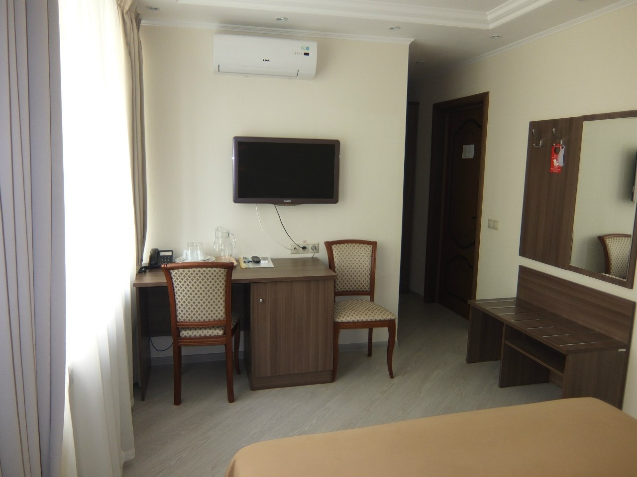 В номере: вешалка, кровать двуспальная, прикроватные тумбочки, стол, стулья, шкаф, кондиционер, набор посуды, телевизор, телефон, холодильник