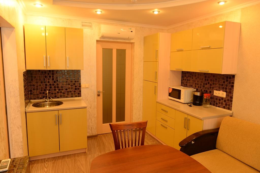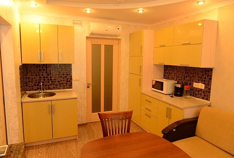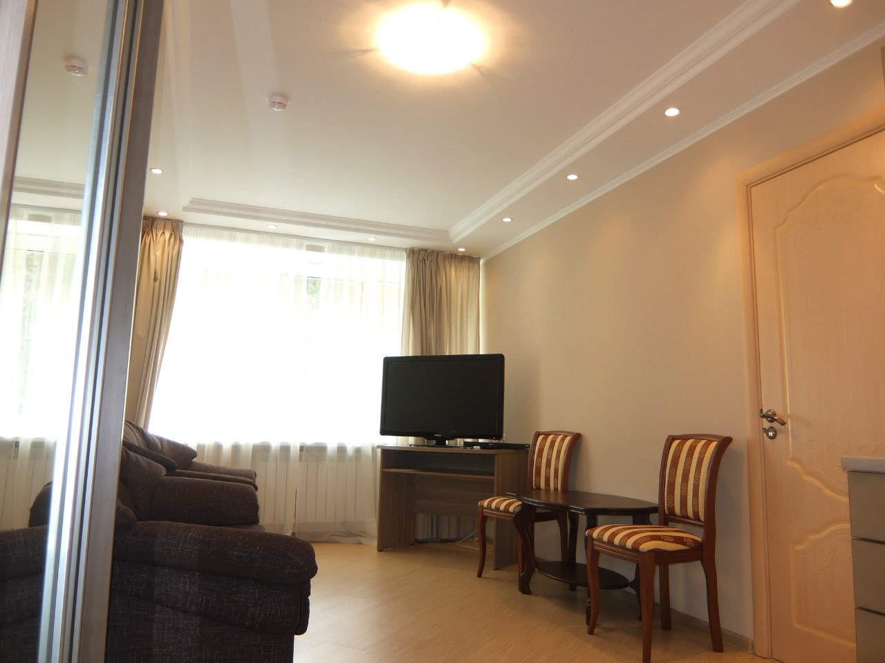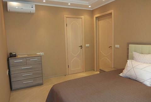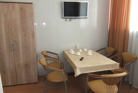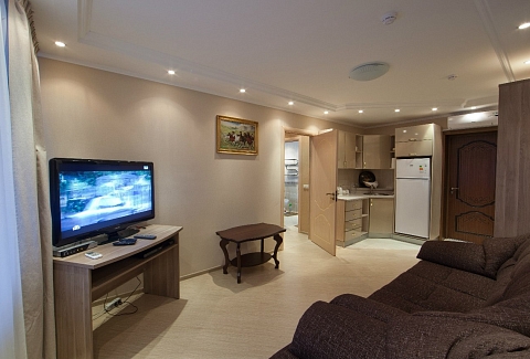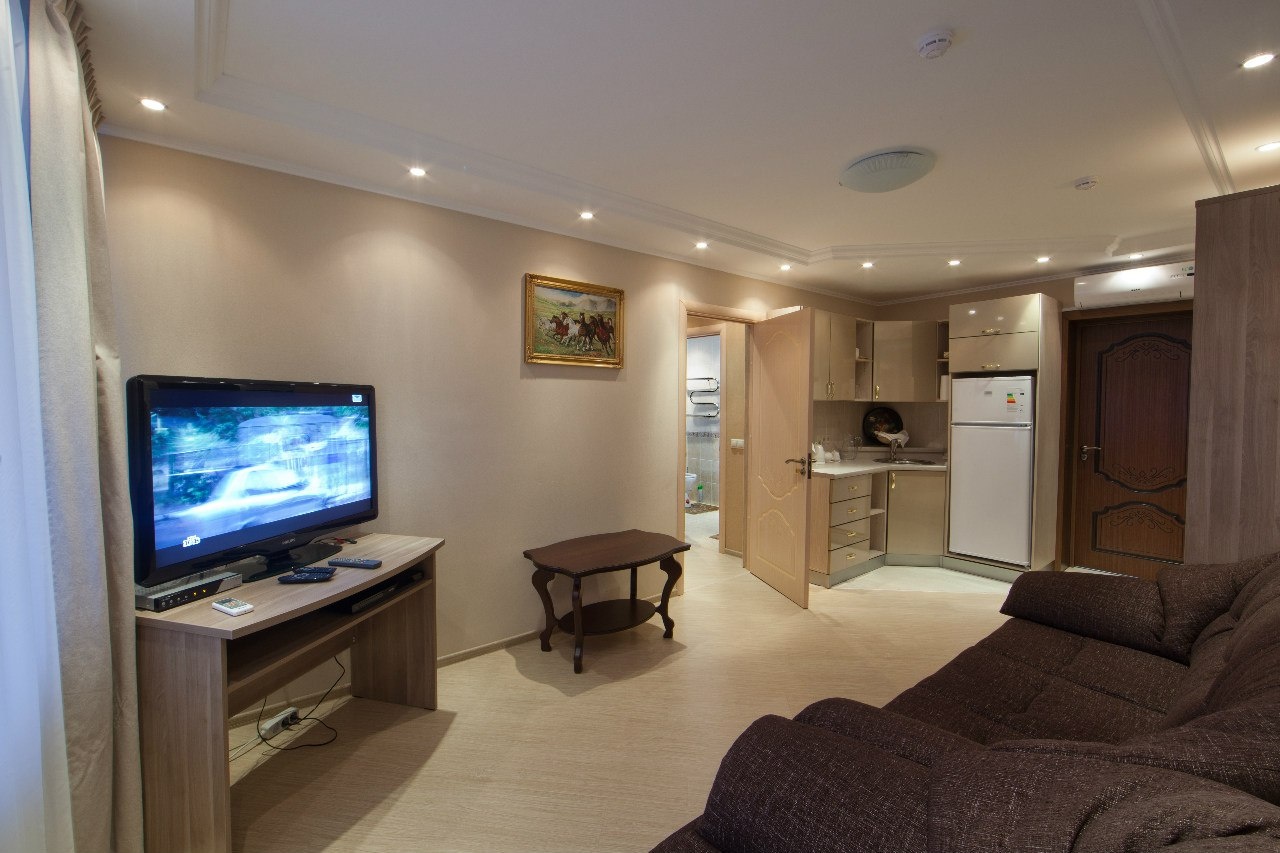 В номере: вешалка, диван, комод, кровать двуспальная, набор мягкой мебели, прикроватные тумбочки, стол, стулья, шкаф, кондиционер, микроволновая печь, набор посуды, телевизор, телефон, холодильник, электрочайник