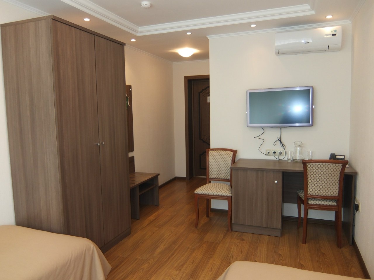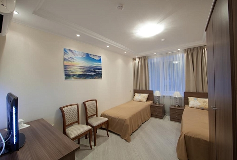 В номере: вешалка, кровати односпальные, прикроватные тумбочки, стол, стулья, шкаф, кондиционер, набор посуды, телевизор, холодильник