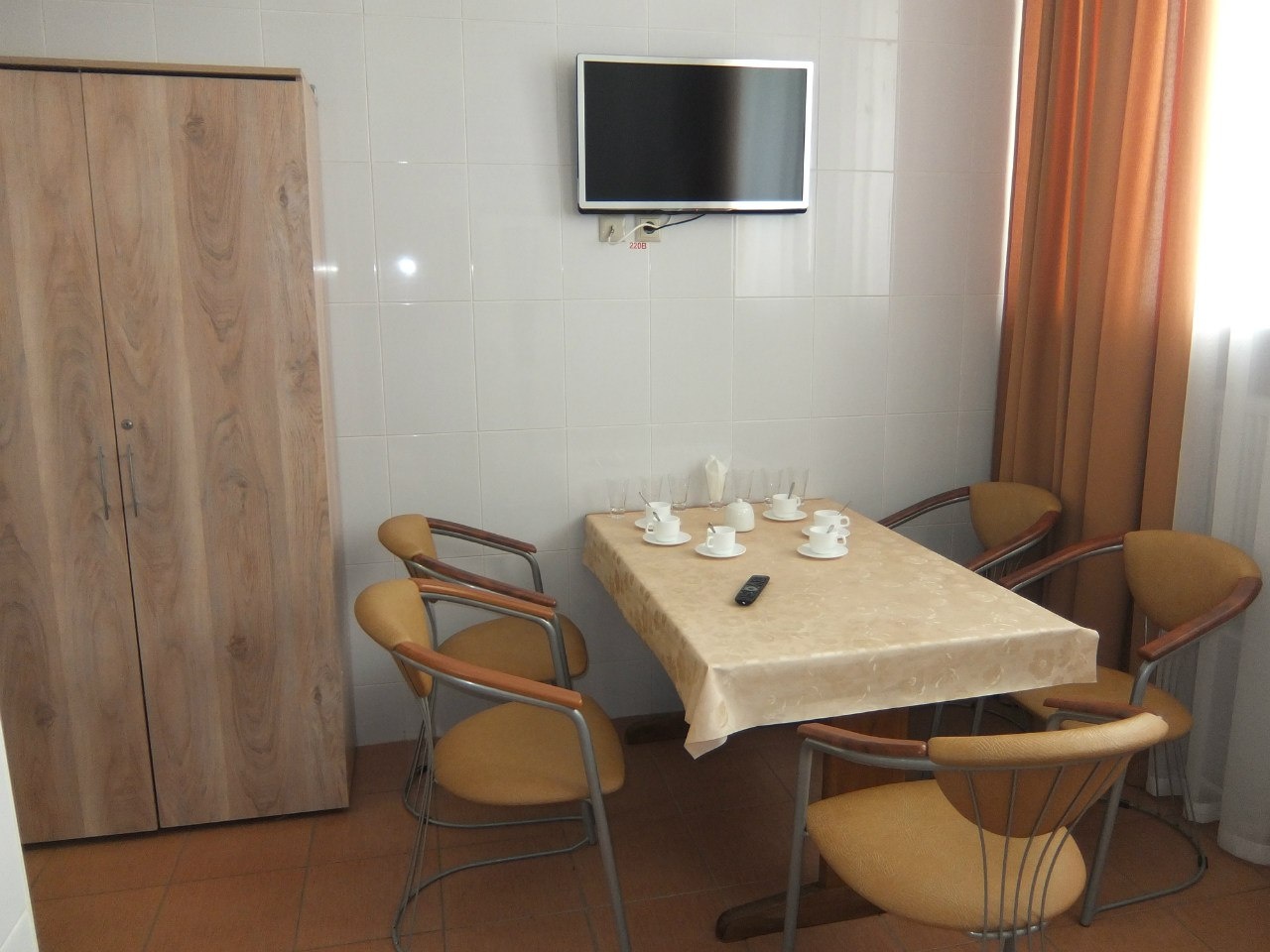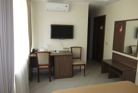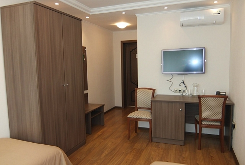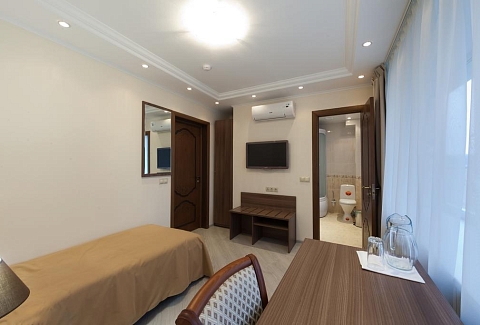 В номере: вешалка, кровать односпальная, прикроватная тумбочка, стол, стул, шкаф, кондиционер, набор посуды, телевизор, холодильник