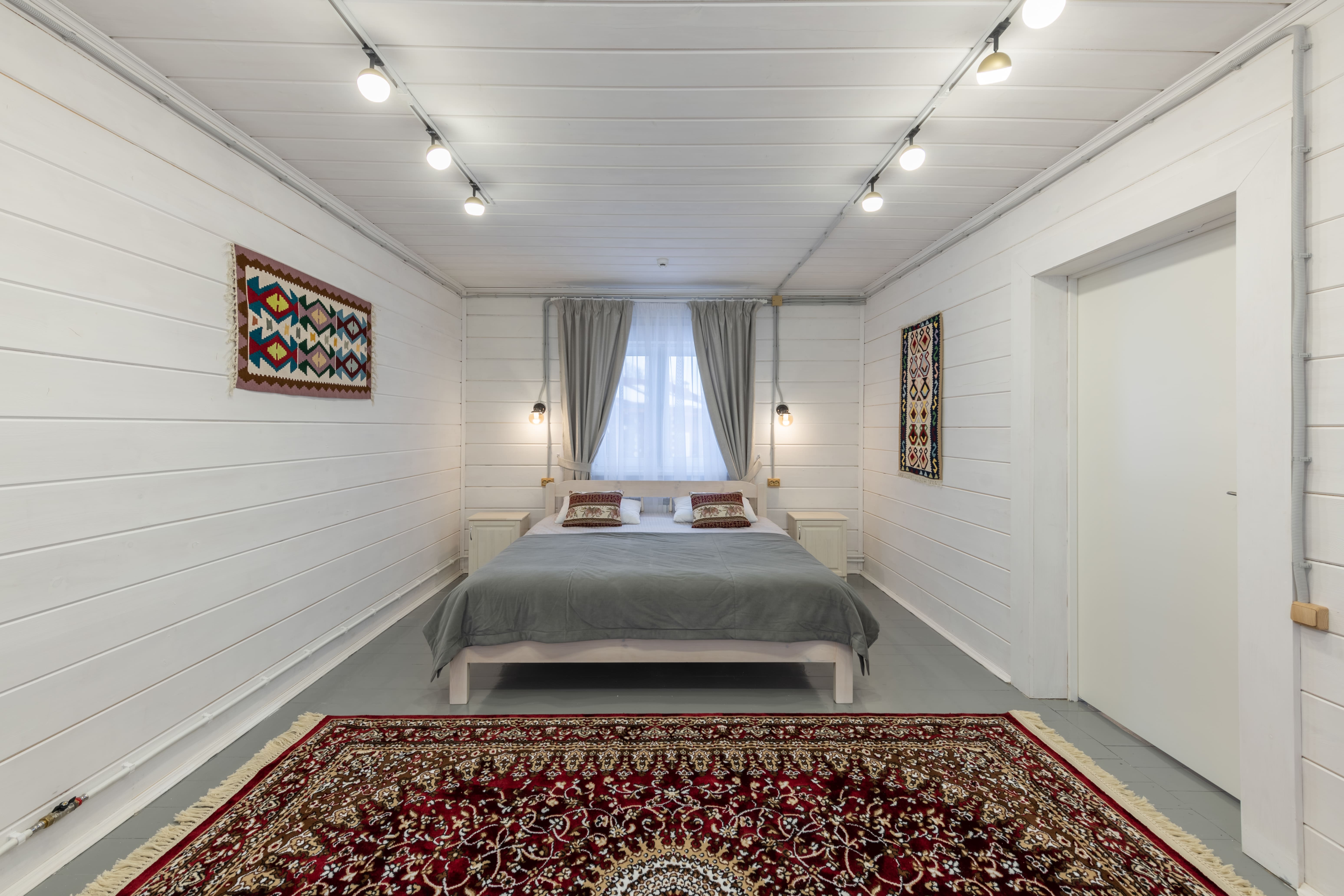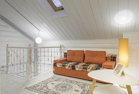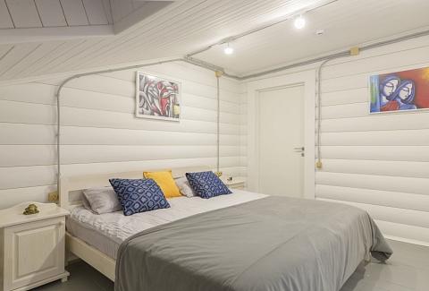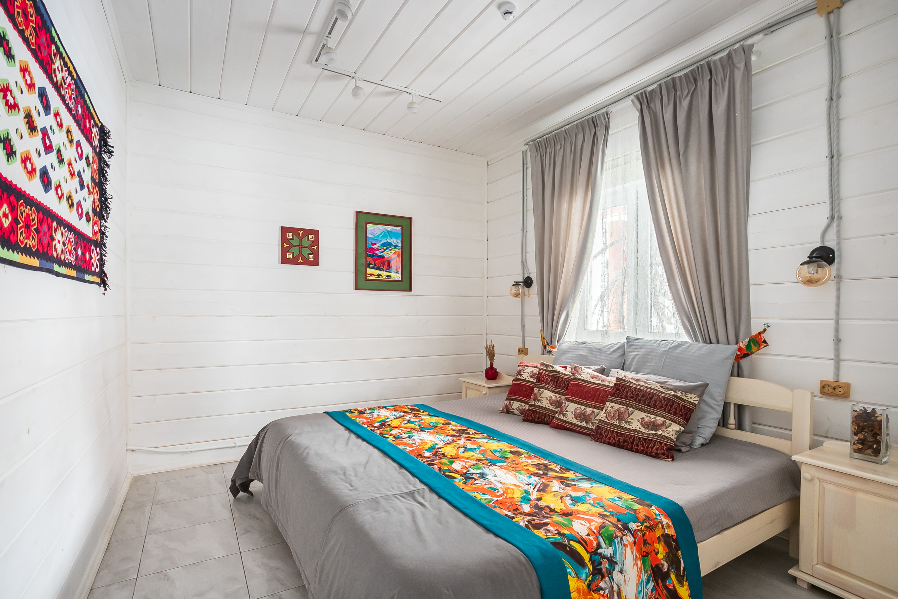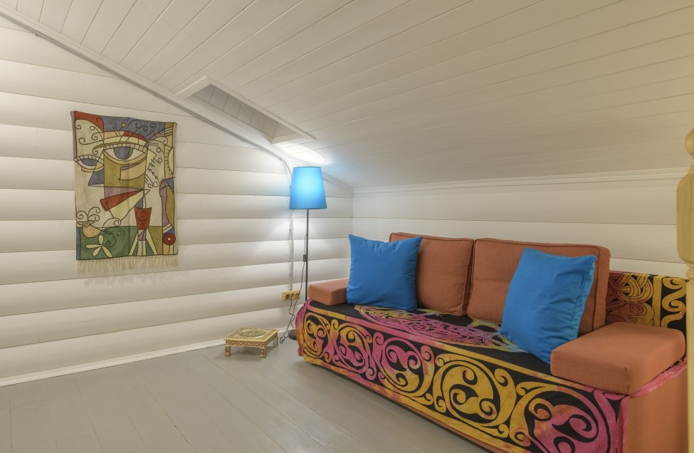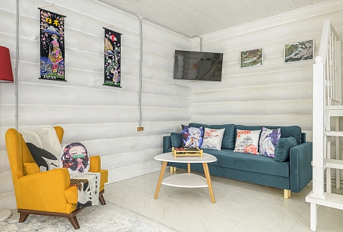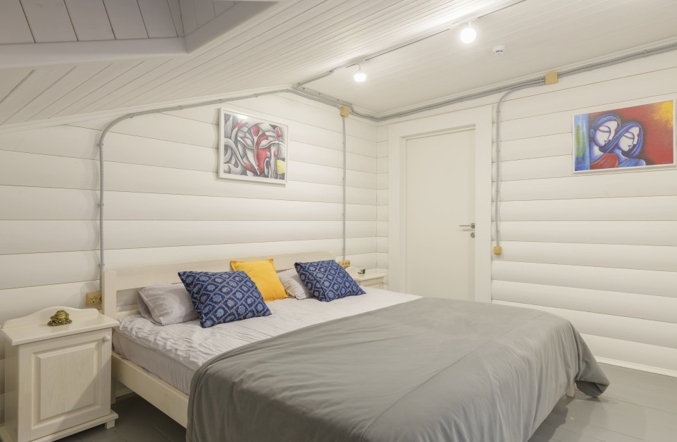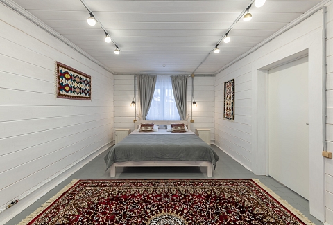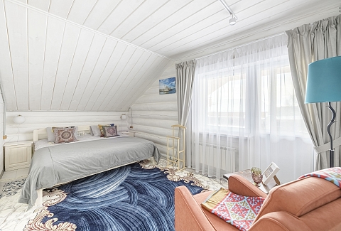 В номере: вешалка, диван, зеркало, кровать двуспальная, прикроватные тумбочки, стол, стулья, шкаф, гладильная доска, кондиционер, микроволновая печь, набор посуды, плита электрическая, телевизор ЖК, теплый пол, утюг, холодильник, чайный набор посуды, электрочайник