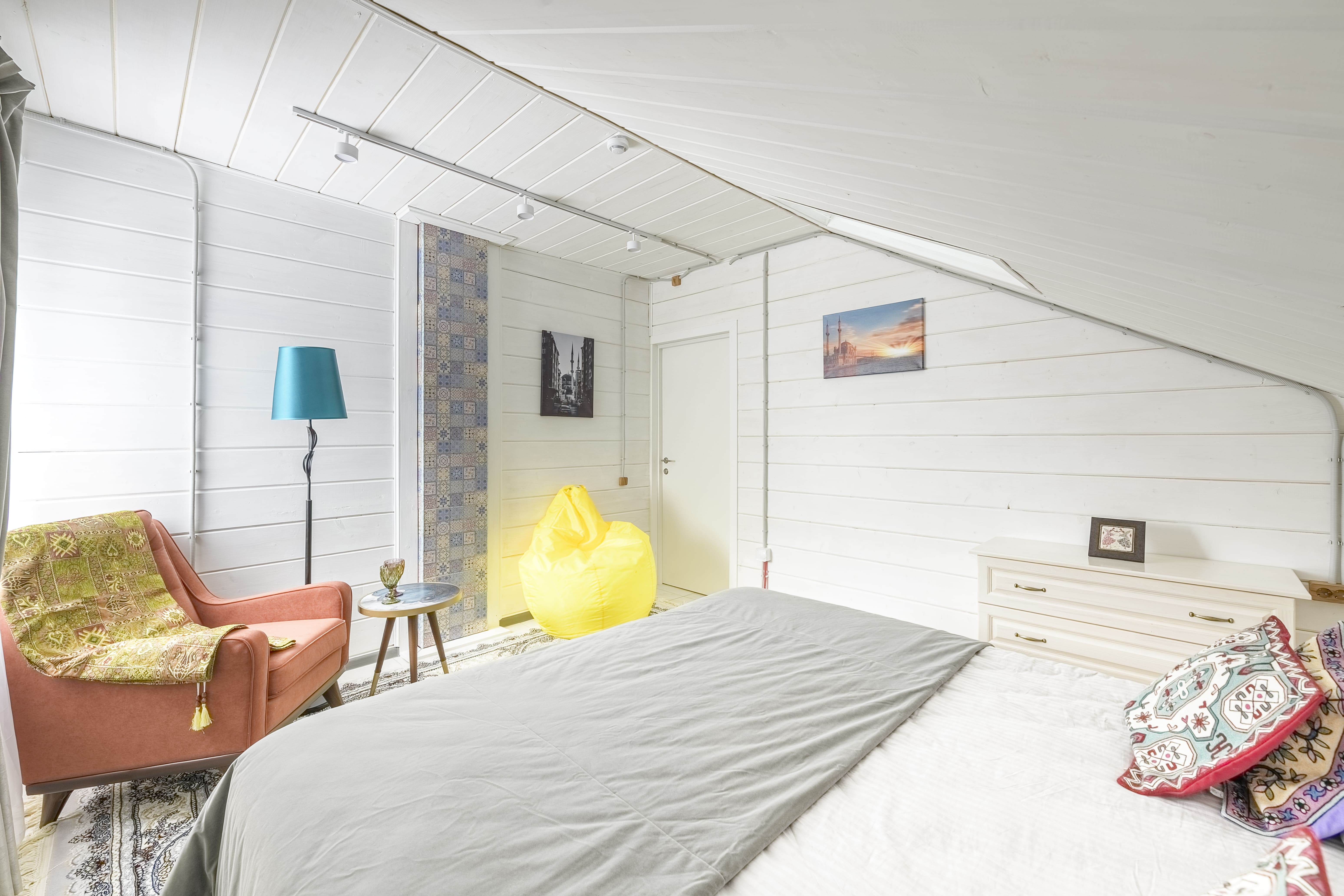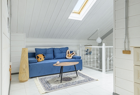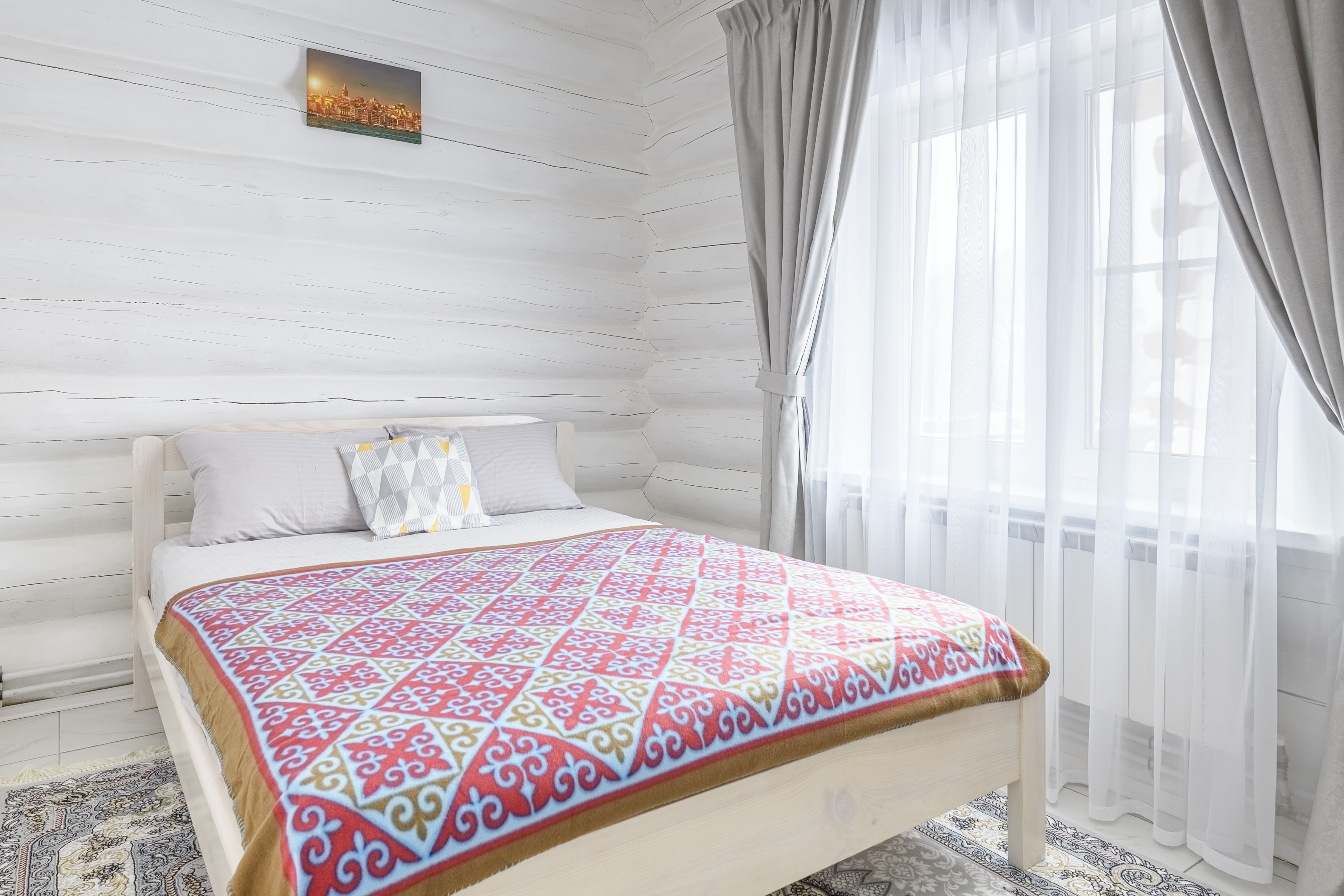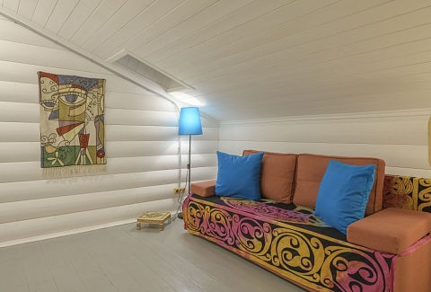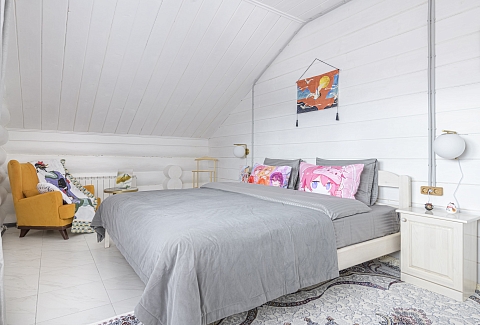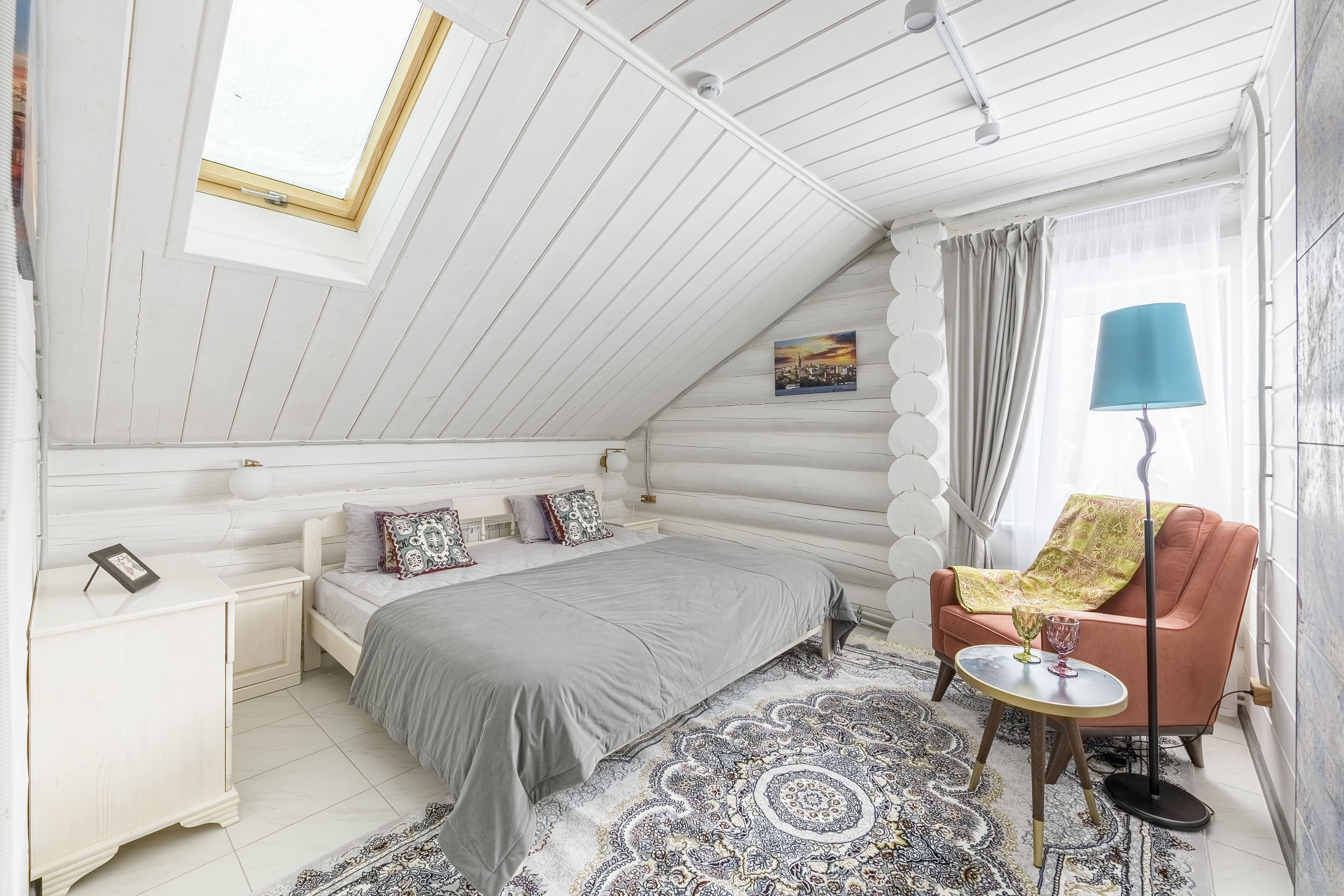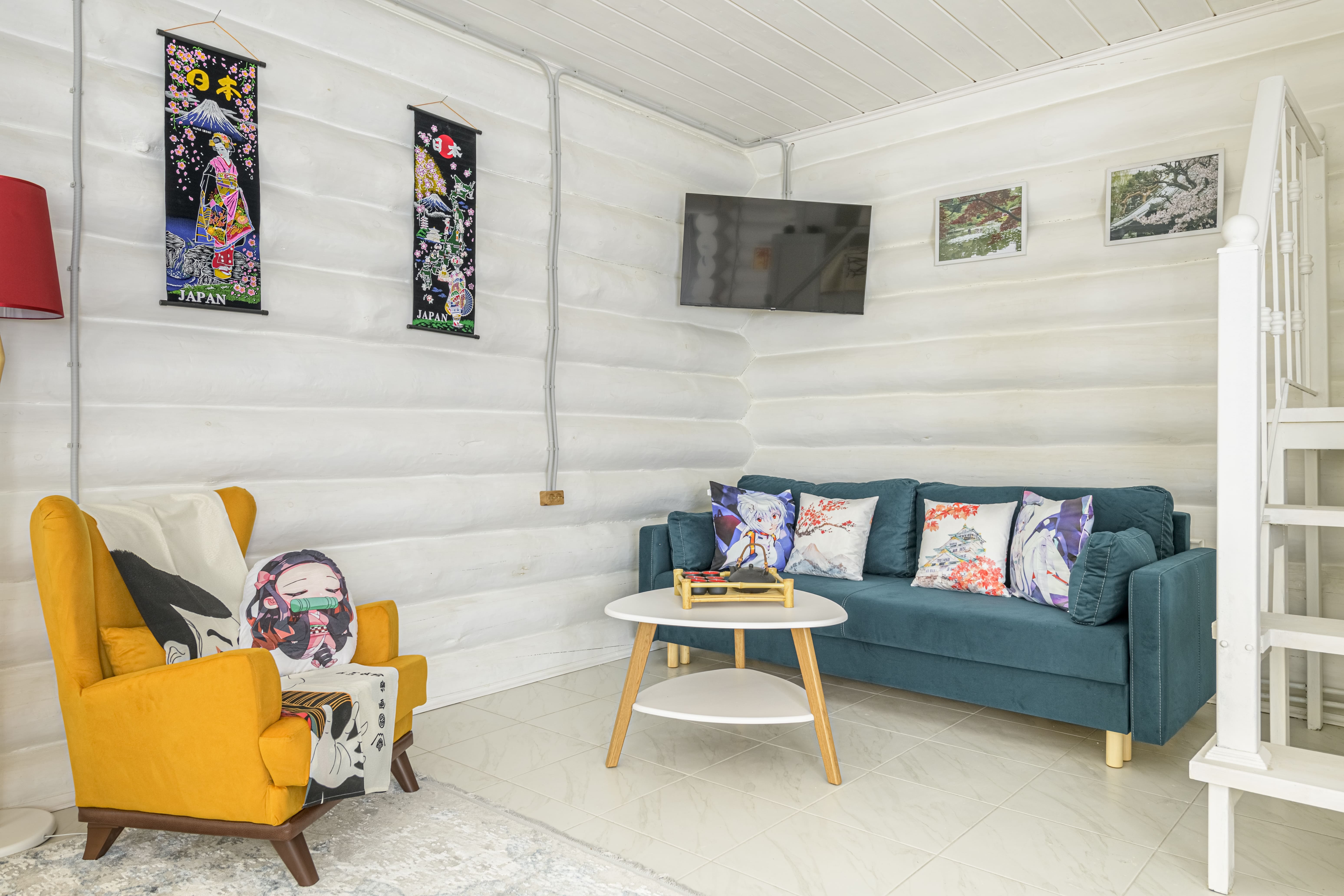 В номере: вешалка, диван, зеркало, кровать двуспальная, прикроватные тумбочки, стол, стулья, шкаф, гладильная доска, кондиционер, микроволновая печь, набор посуды, плита электрическая, телевизор ЖК, теплый пол, утюг, холодильник, чайный набор посуды, электрочайник