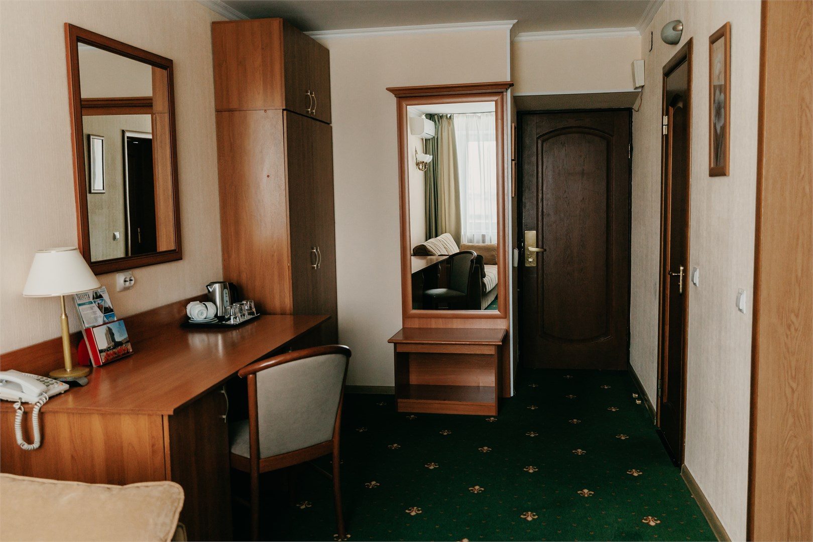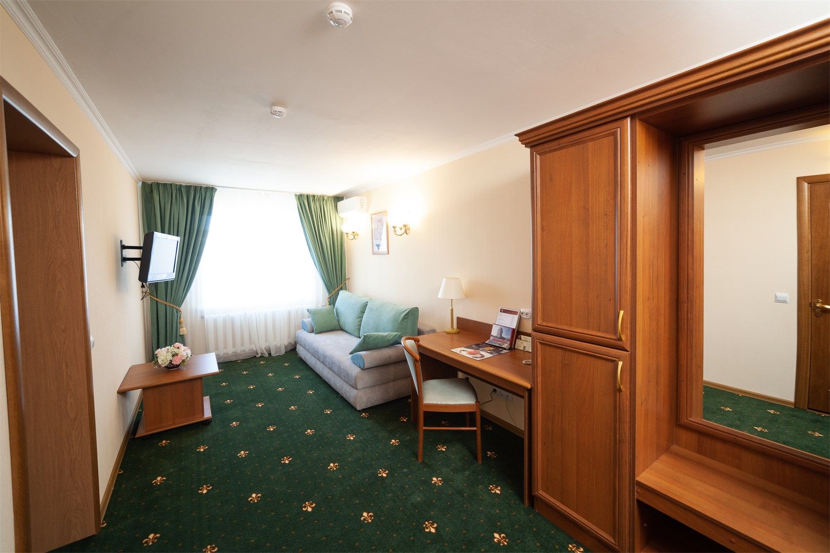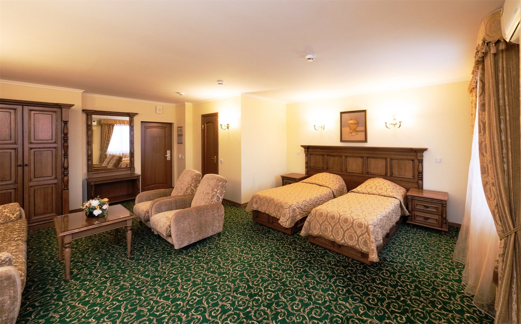 В номере: вешалка, диван раскладной, зеркало, кровати односпальные /одна двуспальная кровать, прикроватные тумбочки, стол, стулья, шкаф, кондиционер, мини-холодильник, сейф, телевизор, телефон, чайник