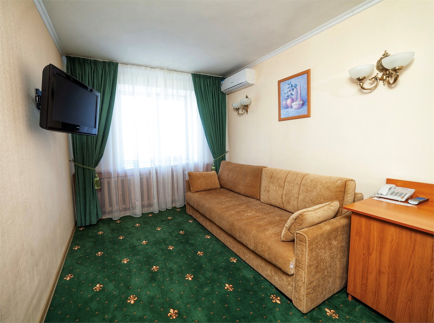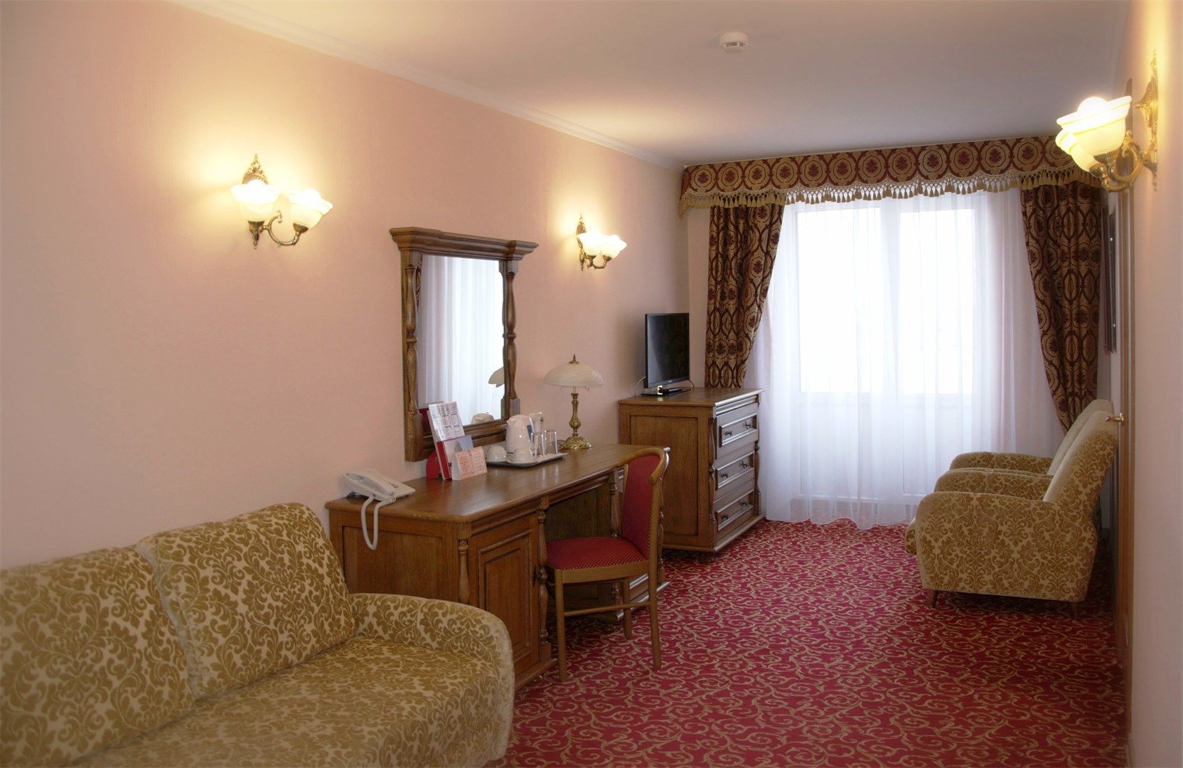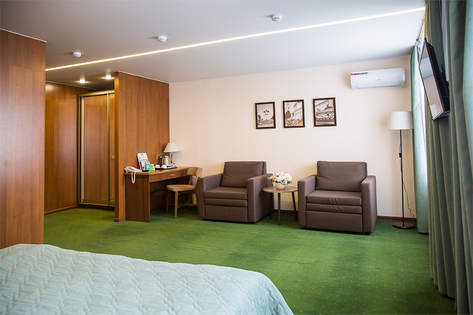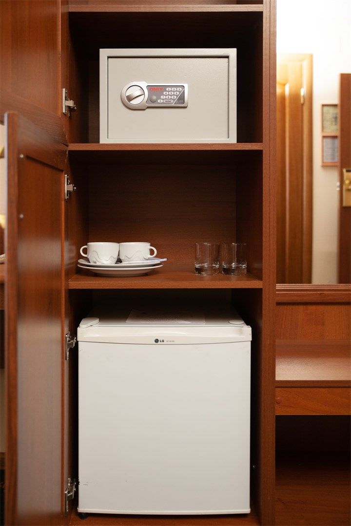 В номере: вешалка, диван раскладной, зеркало, кровати односпальные /одна двуспальная кровать, прикроватные тумбочки, стол, стулья, шкаф, кондиционер, мини-холодильник, сейф, телевизор, телефон, чайник