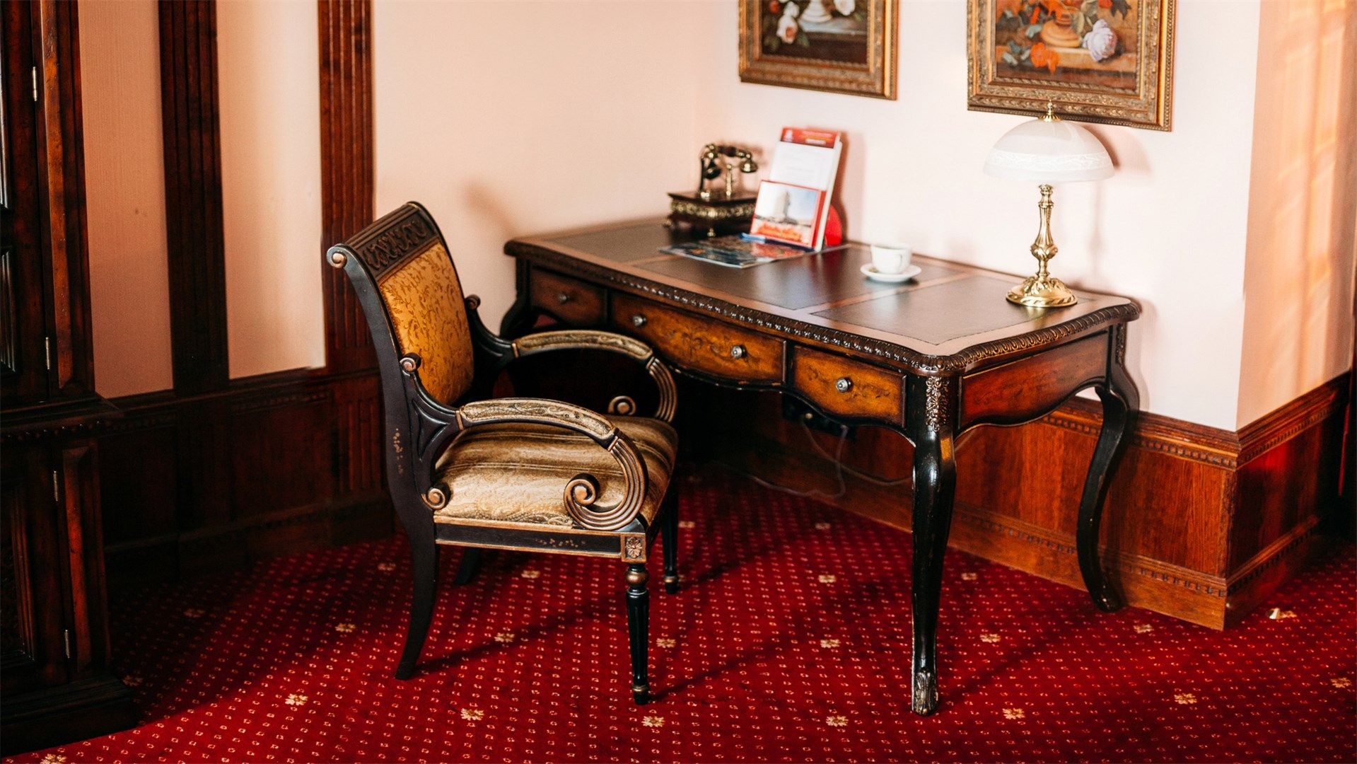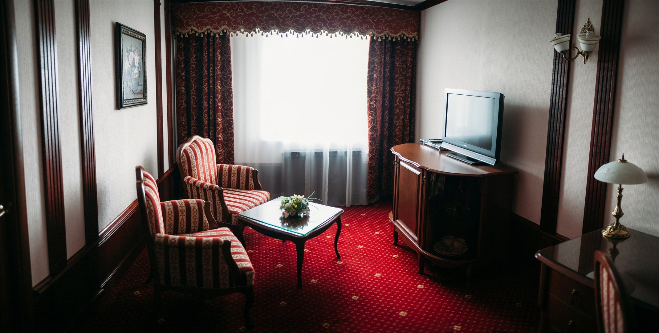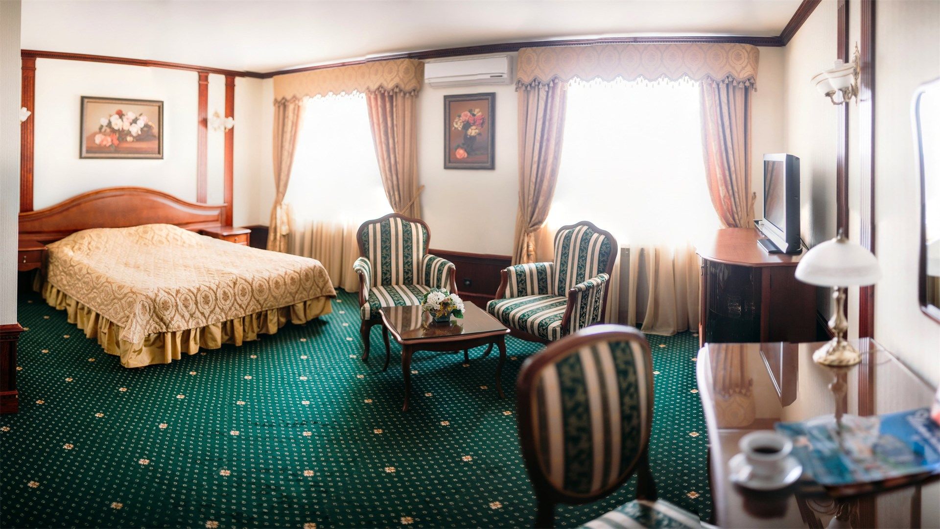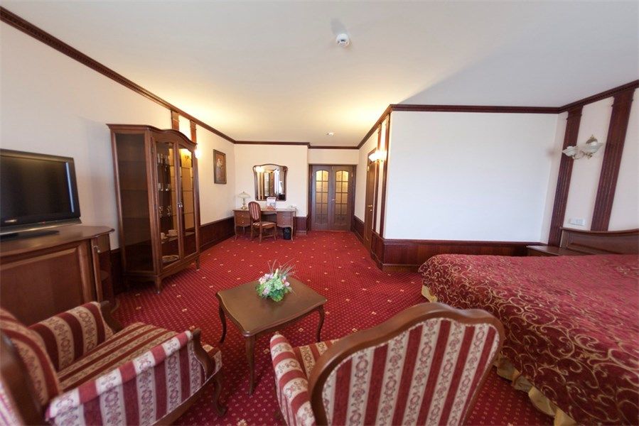 В номере: вешалка, диван, кресла, кровать двуспальная, прикроватные тумбочки, стол, стулья, шкаф, кондиционер, набор посуды, телевизор, телефон, холодильник, чайный набор посуды, электрочайник