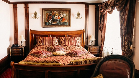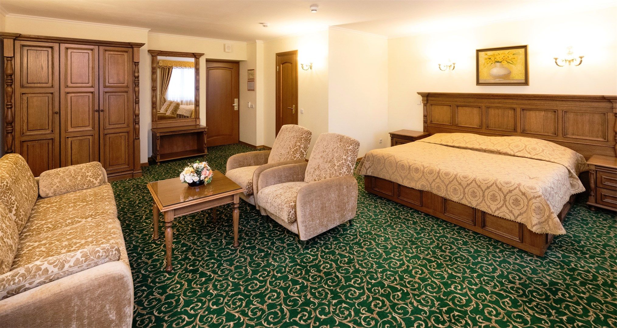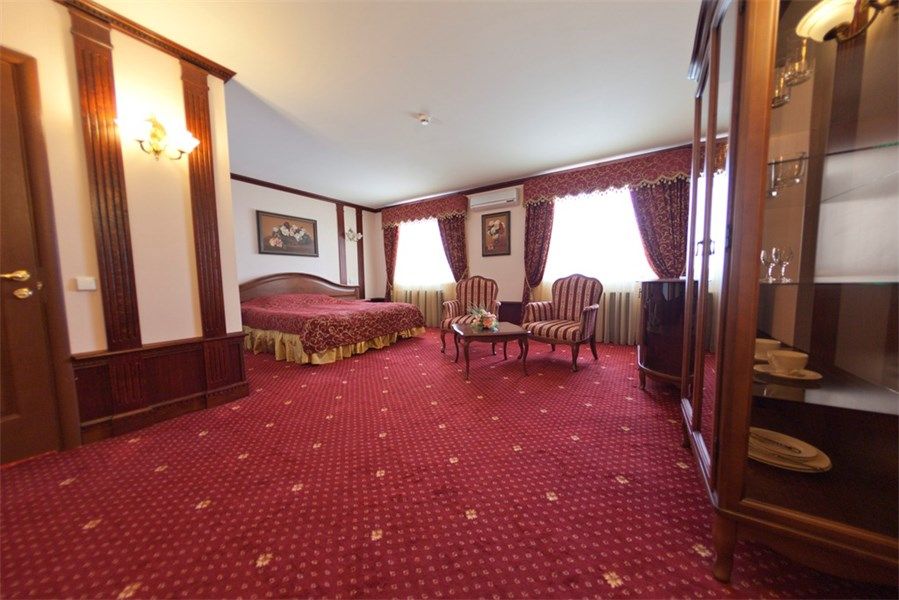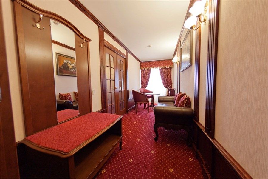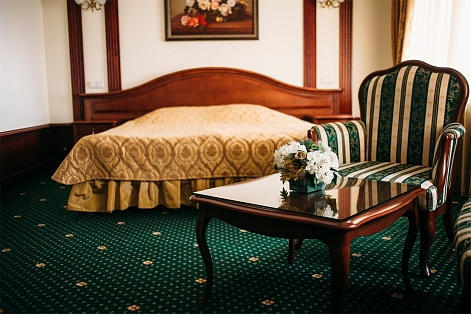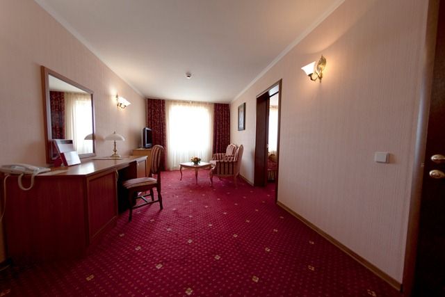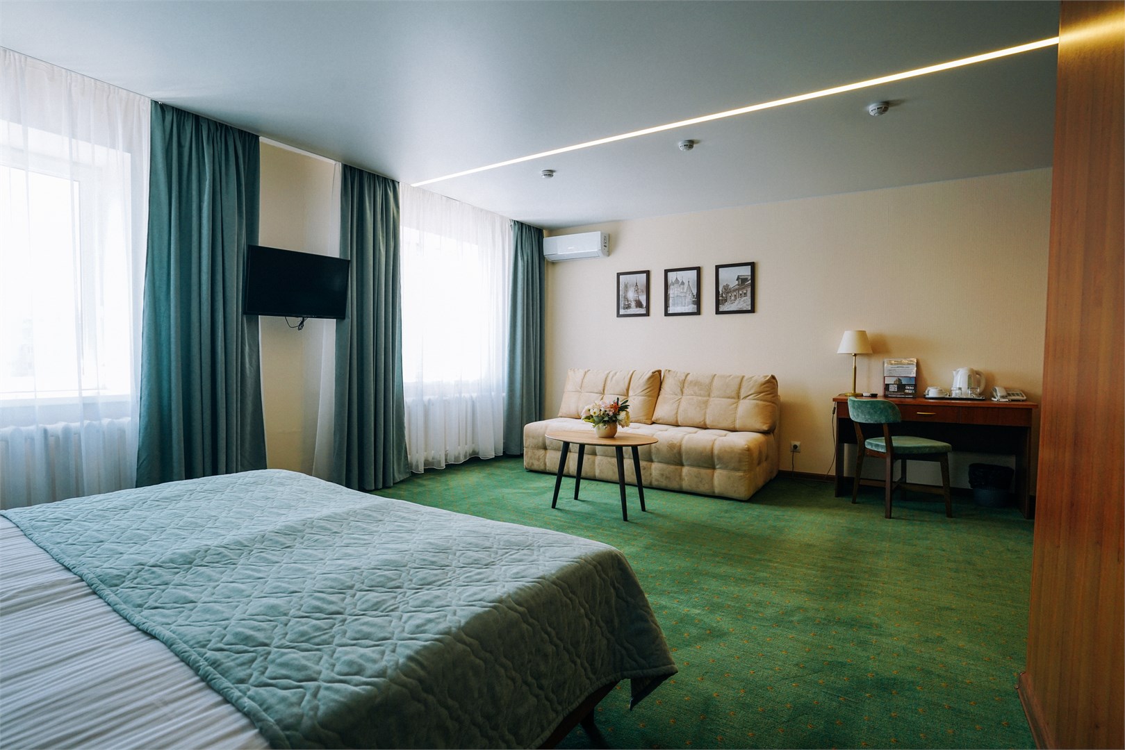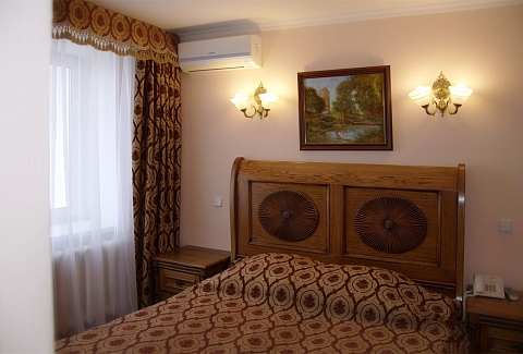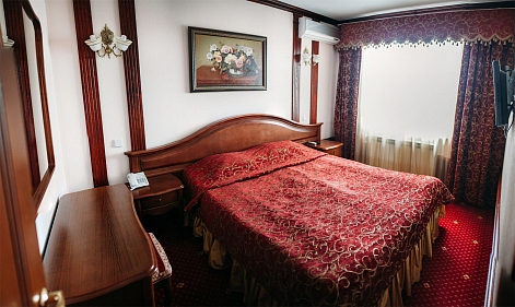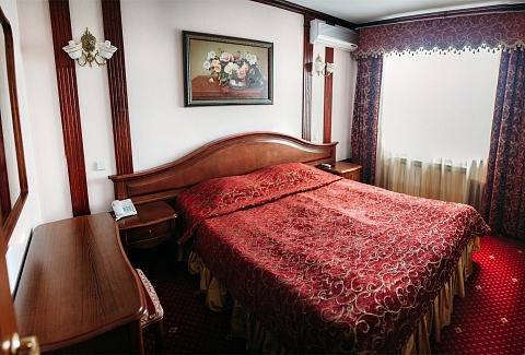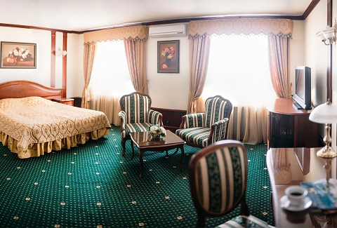 В номере: вешалка, диван, зеркало, кровать двуспальная, прикроватные тумбочки, стол, стулья, шкаф, кондиционер, сейф, телевизор, телефон, холодильник, чайный набор посуды, электрочайник