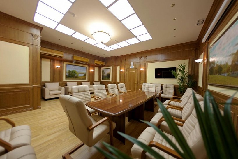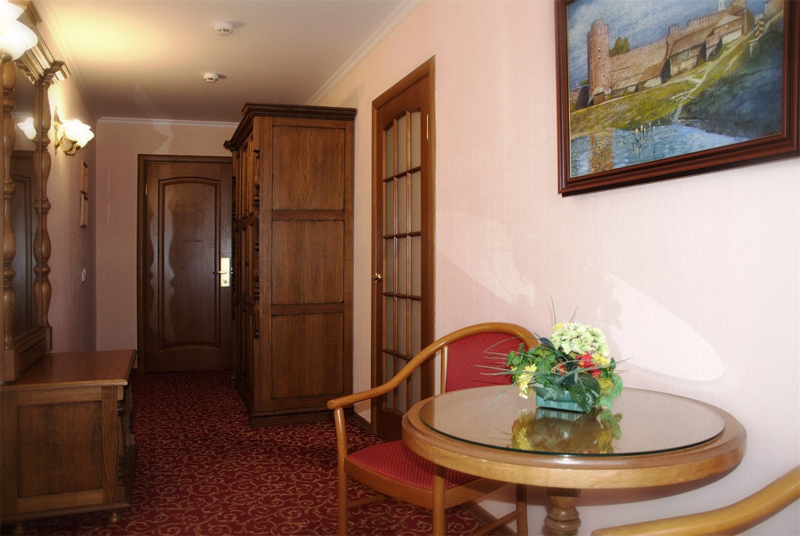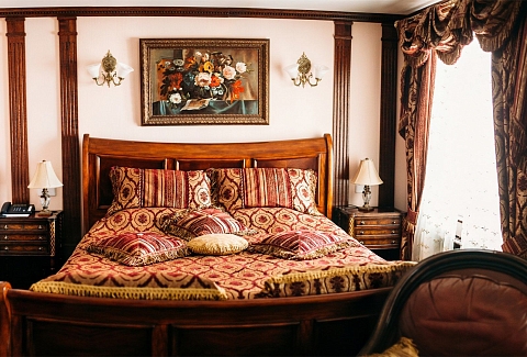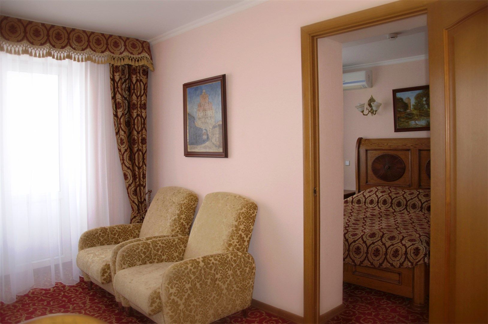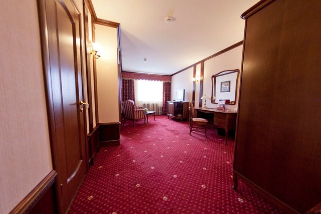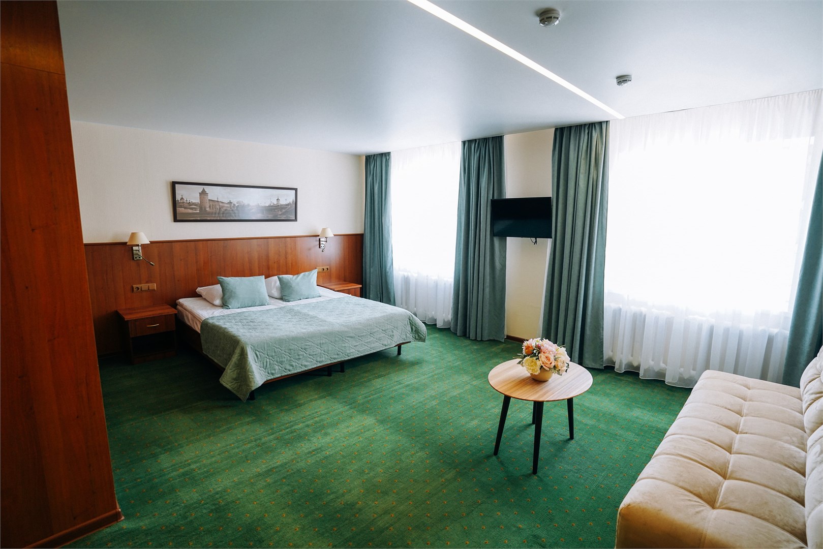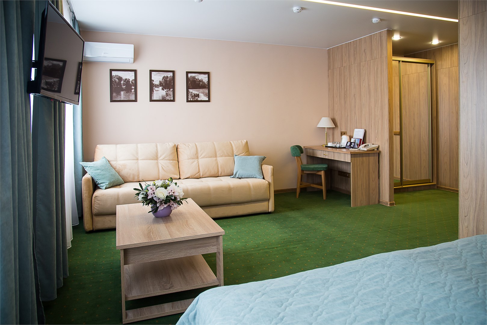 В номере: вешалка, диван, зеркало, кровать двуспальная, прикроватные тумбочки, стол, стулья, шкаф, кондиционер, сейф, телевизор, телефон, холодильник, чайный набор посуды, электрочайник
