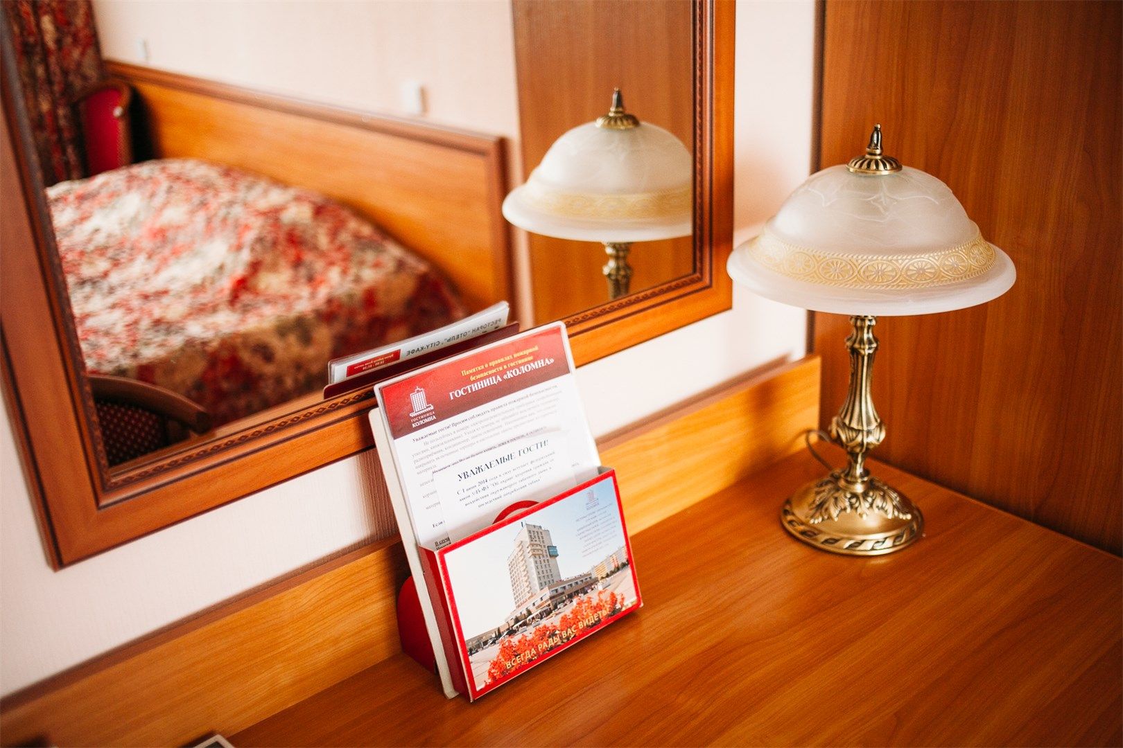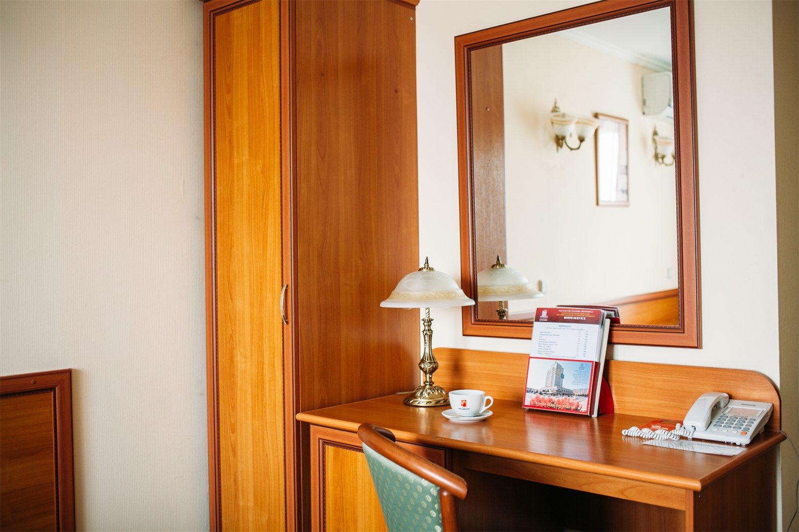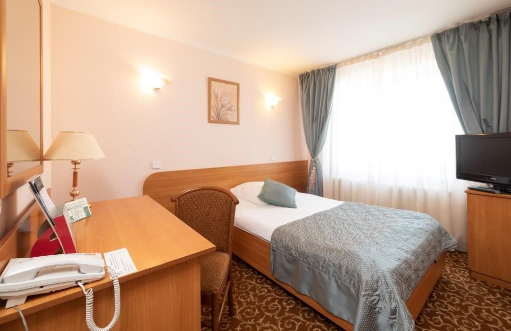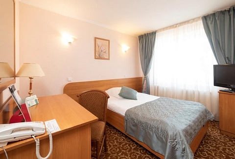 В номере: вешалка, зеркало, кровать односпальная, прикроватная тумбочка, стол, стул, шкаф, набор посуды, телевизор, телефон, холодильник