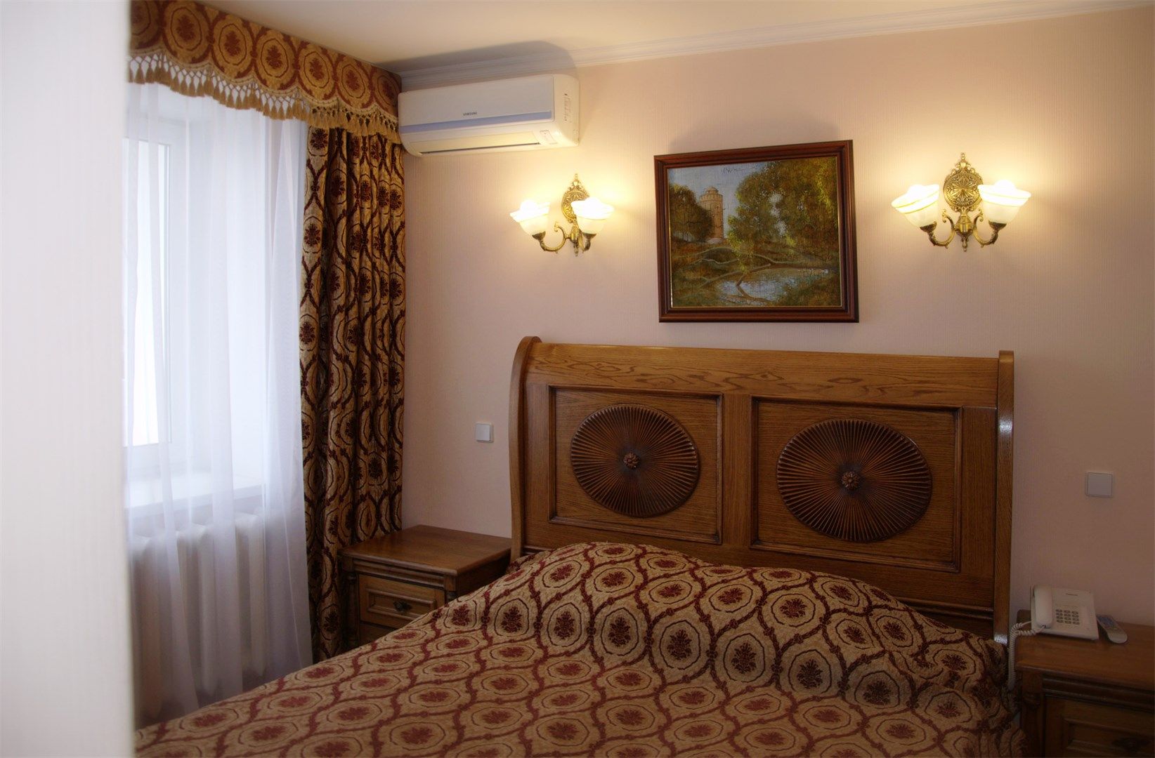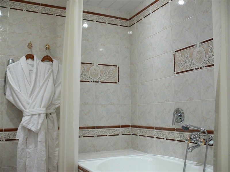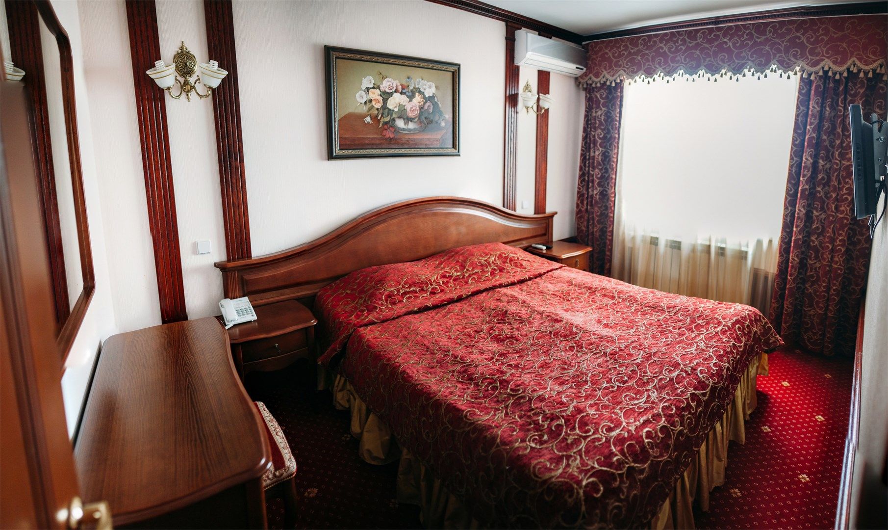 В номере: вешалка, зеркало, кровать двуспальная, прикроватные тумбочки, стол, стулья, шкаф, кондиционер, сейф, телевизор, телефон, холодильник, чайный набор посуды, электрочайник