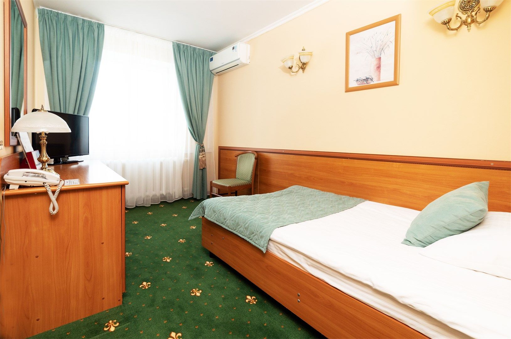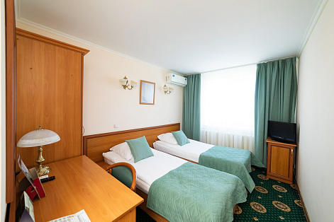В номере: вешалка, зеркало, кровати односпальные, прикроватные тумбочки, стол, стулья, шкаф, кондиционер, мини-холодильник, сейф, телевизор, телефон, чайник