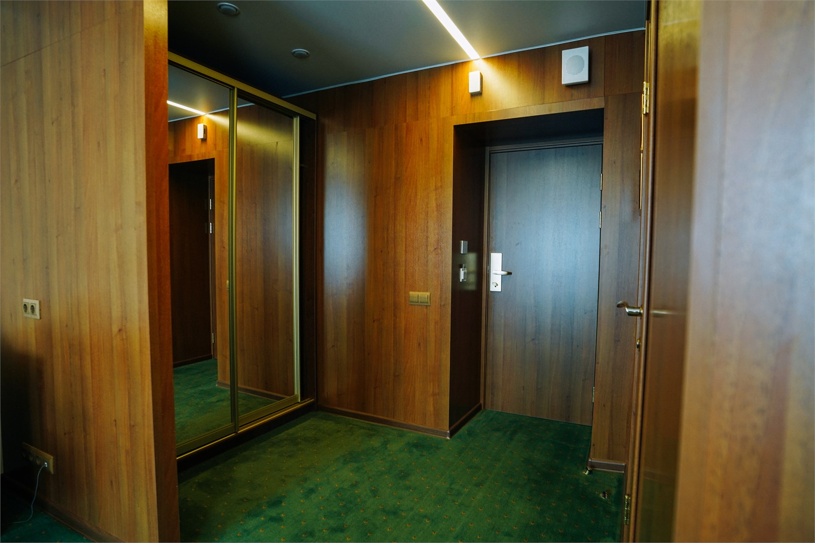 В номере: вешалка, диван, зеркало, кровати односпальные /одна двуспальная кровать, прикроватные тумбочки, стол, стулья, шкаф, кондиционер, набор посуды, сейф, телевизор, телефон, холодильник, чайный набор посуды, электрочайник
