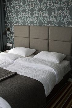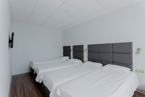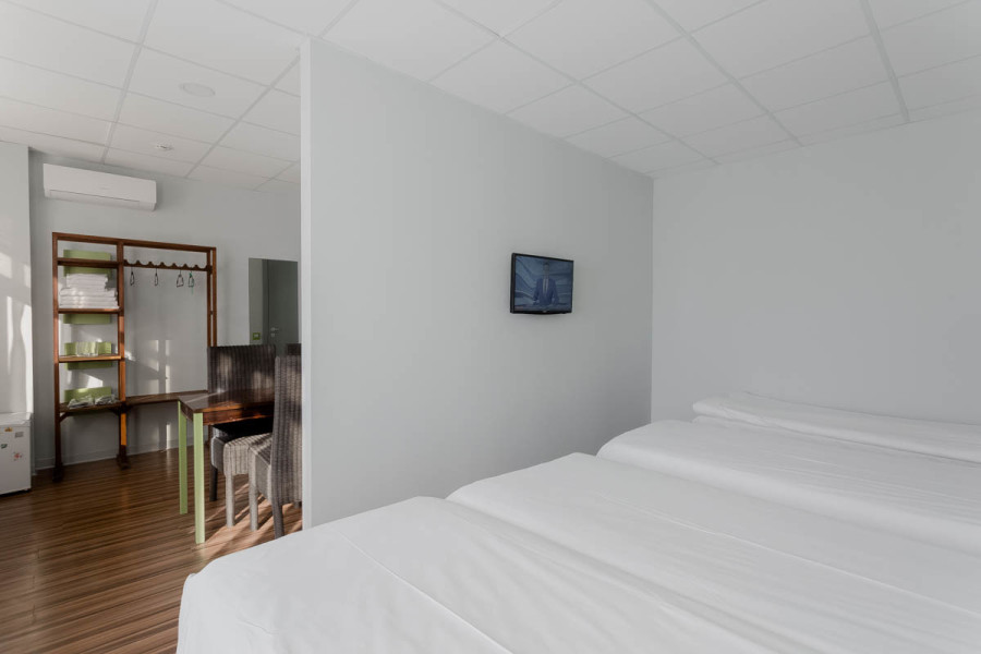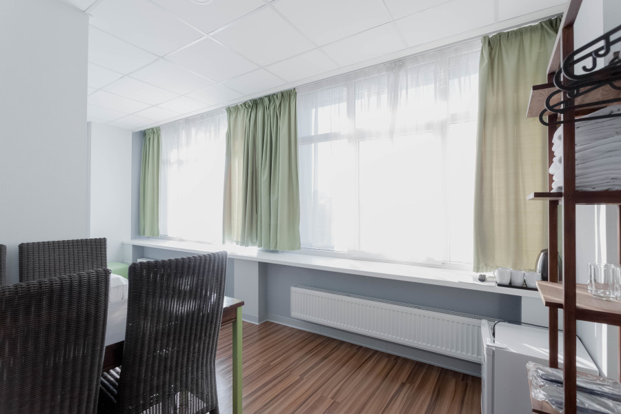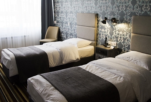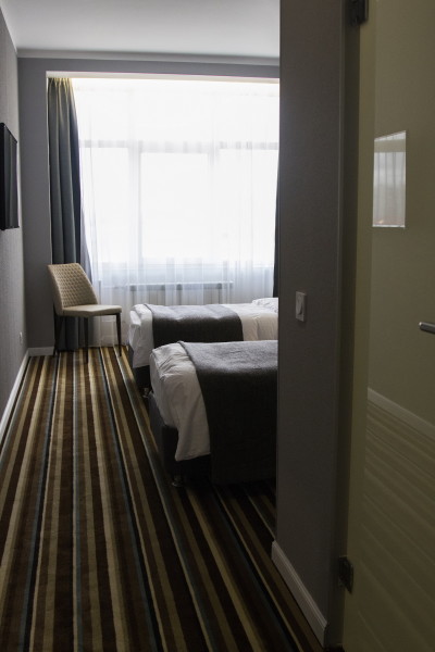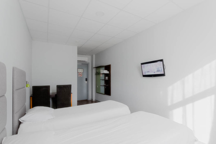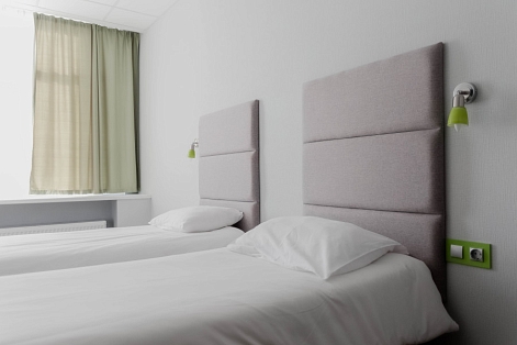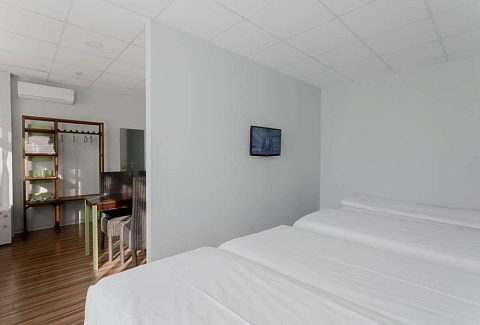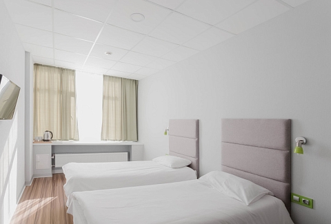 В номере: зеркало, кровати односпальные, стол, стул, шкаф, кондиционер, мини-холодильник, телевизор ЖК, электрочайник