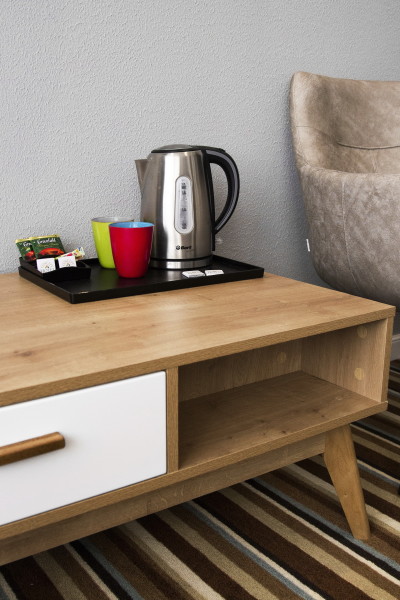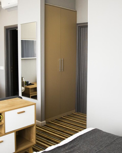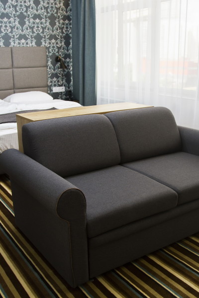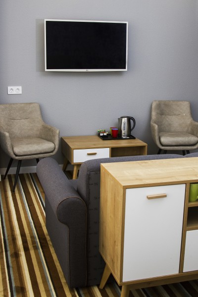 В номере: диван, зеркало, кровать двуспальная, прикроватные тумбочки, стол, стул, шкаф, кондиционер, мини-холодильник, телевизор ЖК, электрочайник