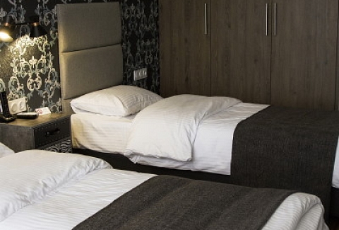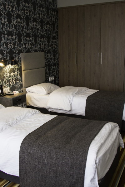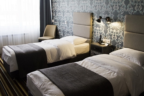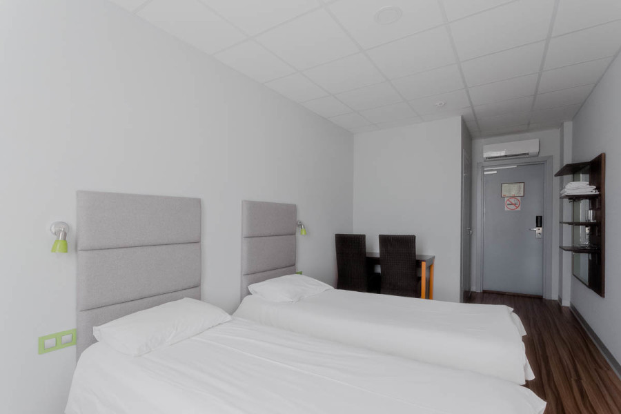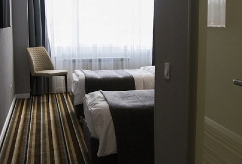 В номере: зеркало, кровати односпальные, прикроватные тумбочки, стол, стул, шкаф, кондиционер, мини-холодильник, телевизор ЖК, электрочайник