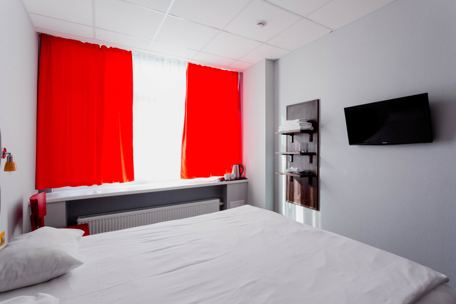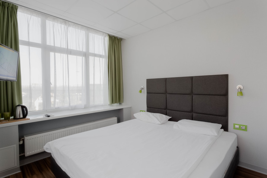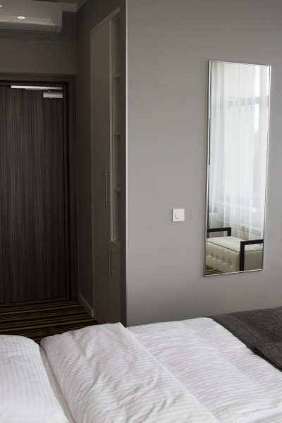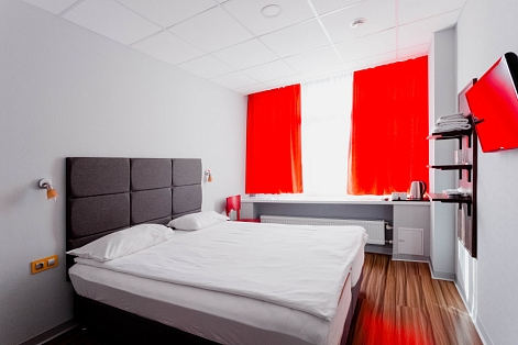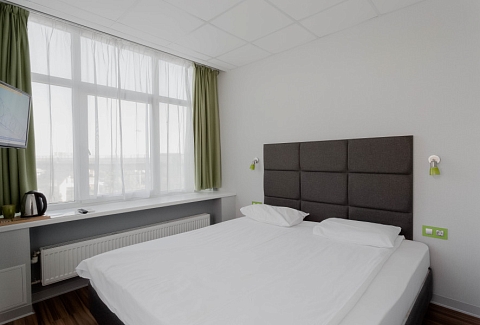 В номере: зеркало, кровать двуспальная, стол, стул, шкаф, кондиционер, мини-холодильник, телевизор ЖК, электрочайник