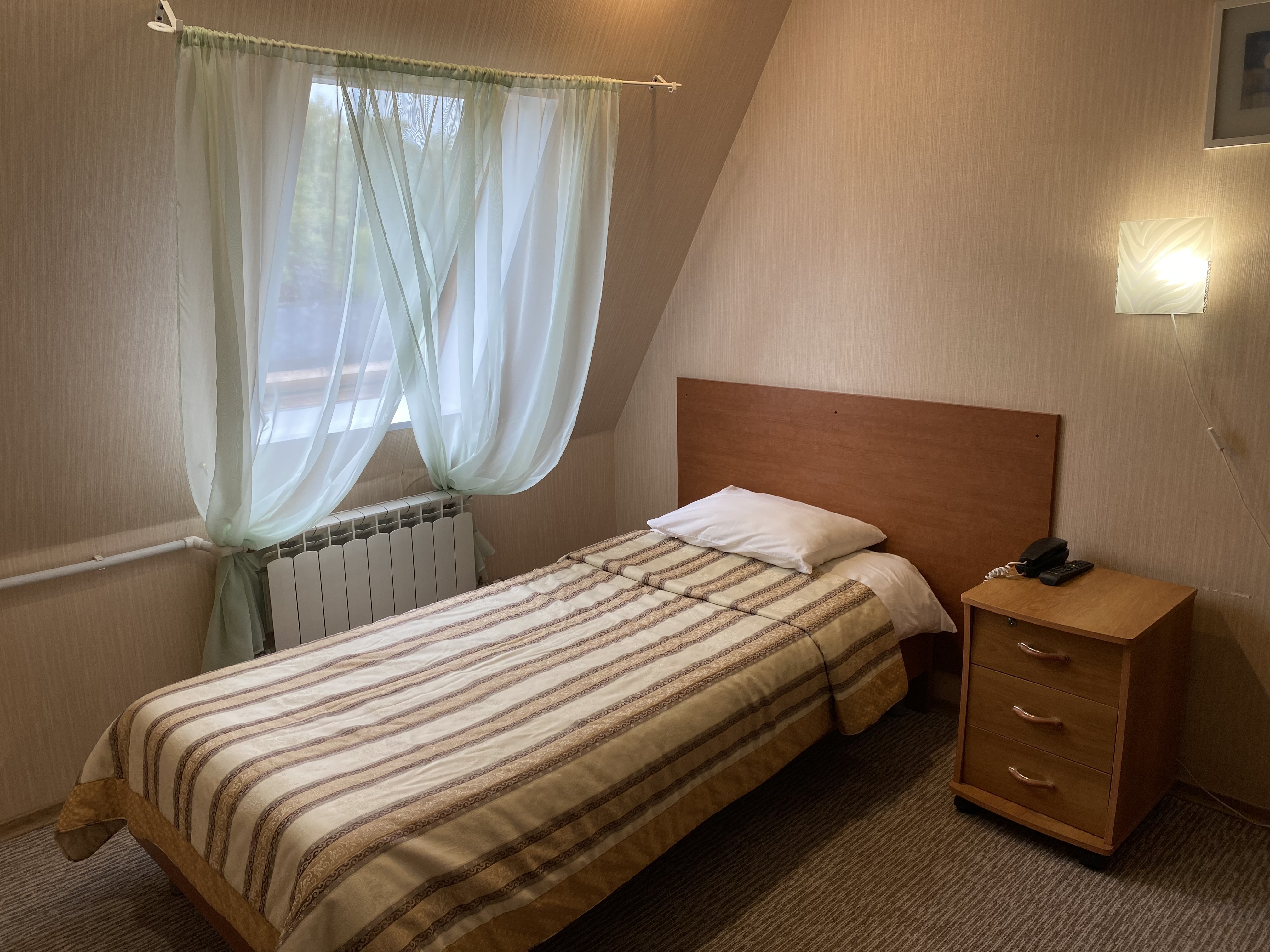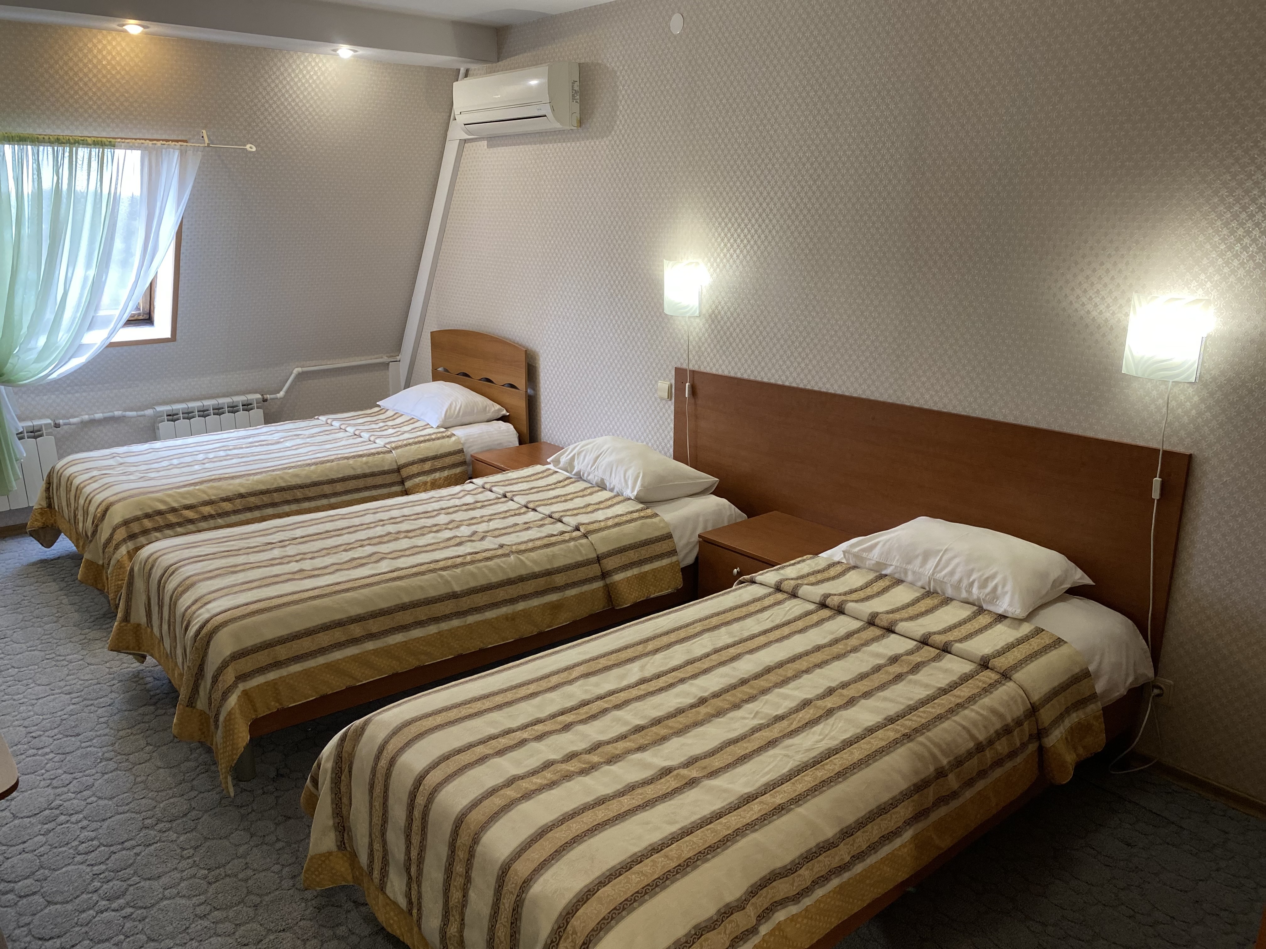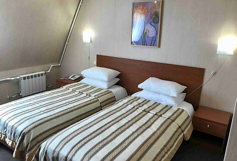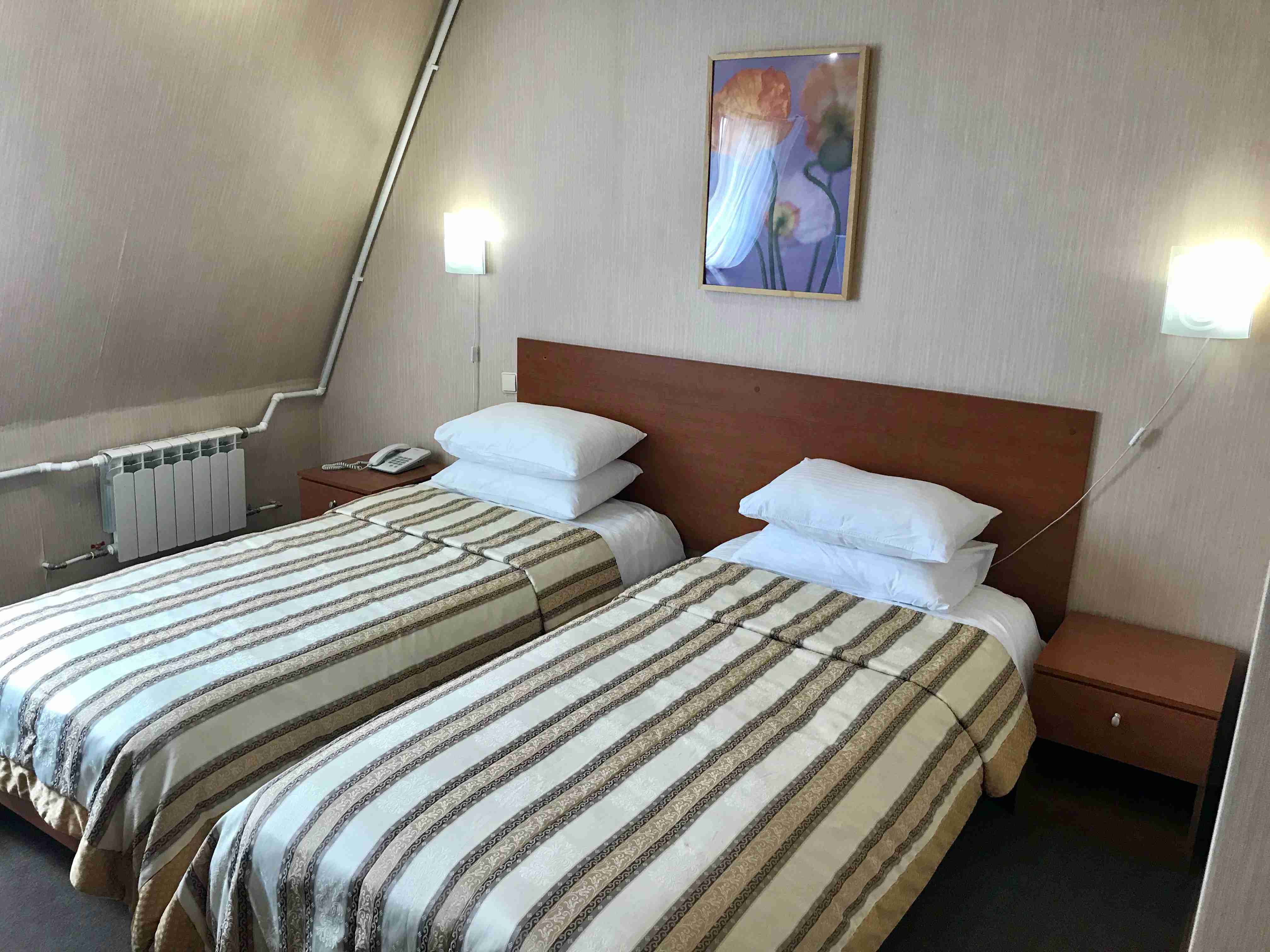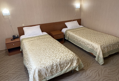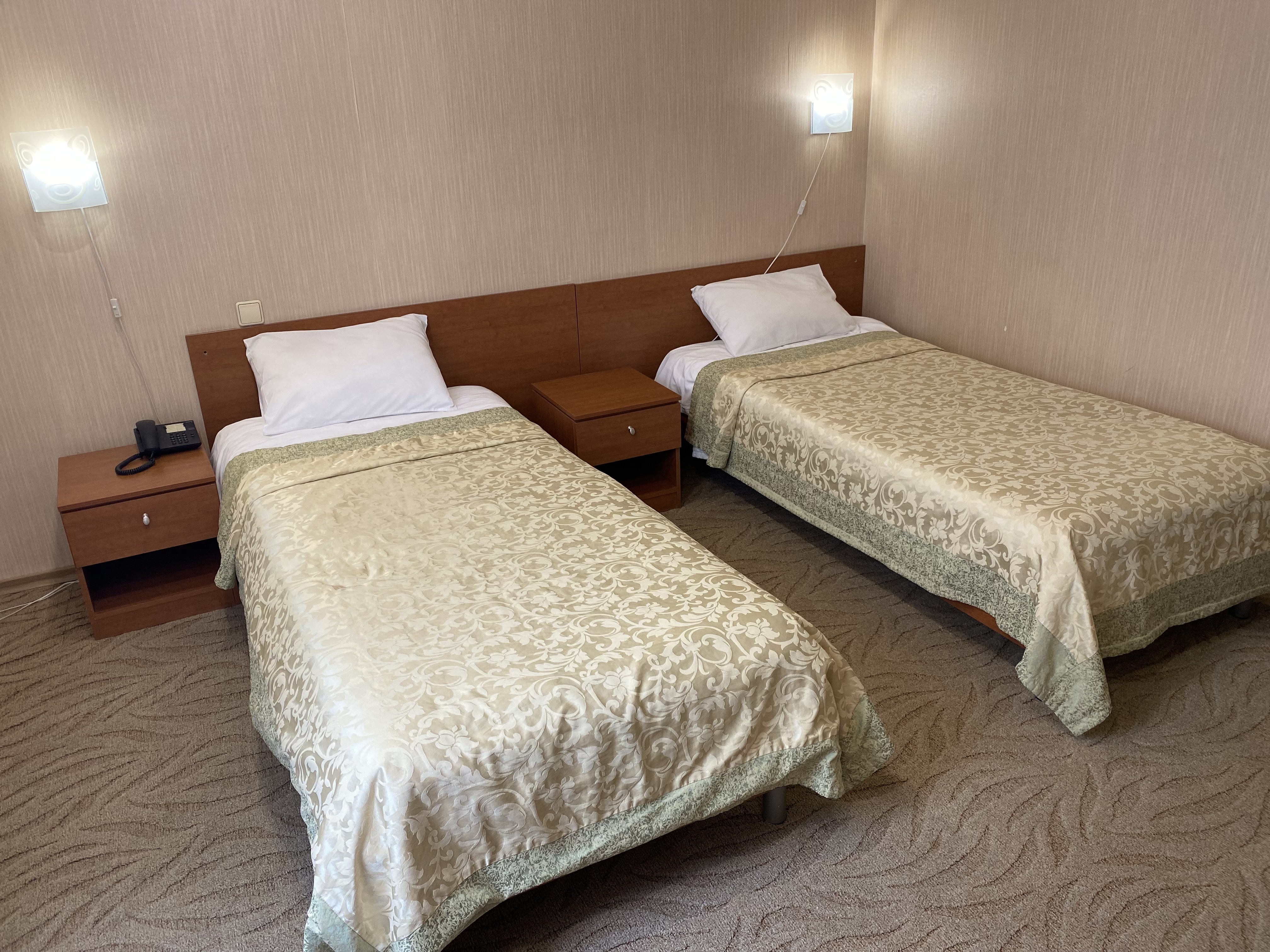 В номере: зеркало, кровати односпальные, прикроватные тумбочки, стол, стулья, шкаф, мини-холодильник, телевизор ЖК, телефон