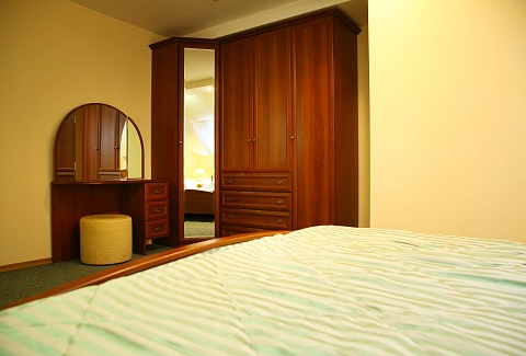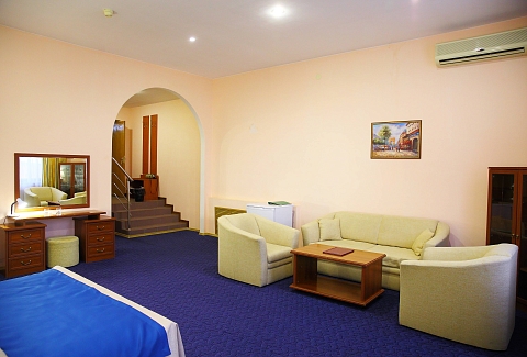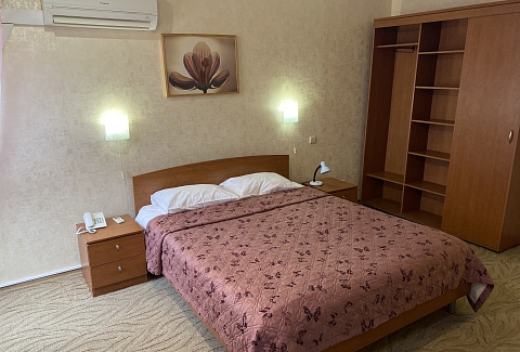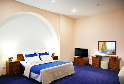 В номере: зеркало, кровать двуспальная, набор мягкой мебели, прикроватные тумбочки, стол, столик туалетный, стул, шкаф, мини-холодильник, телевизор ЖК, телефон