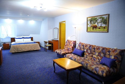 В номере: зеркало, кровать двуспальная, набор мягкой мебели, прикроватные тумбочки, стол, столик журнальный, столик туалетный, стулья, шкаф, мини-холодильник, телевизор ЖК, телефон